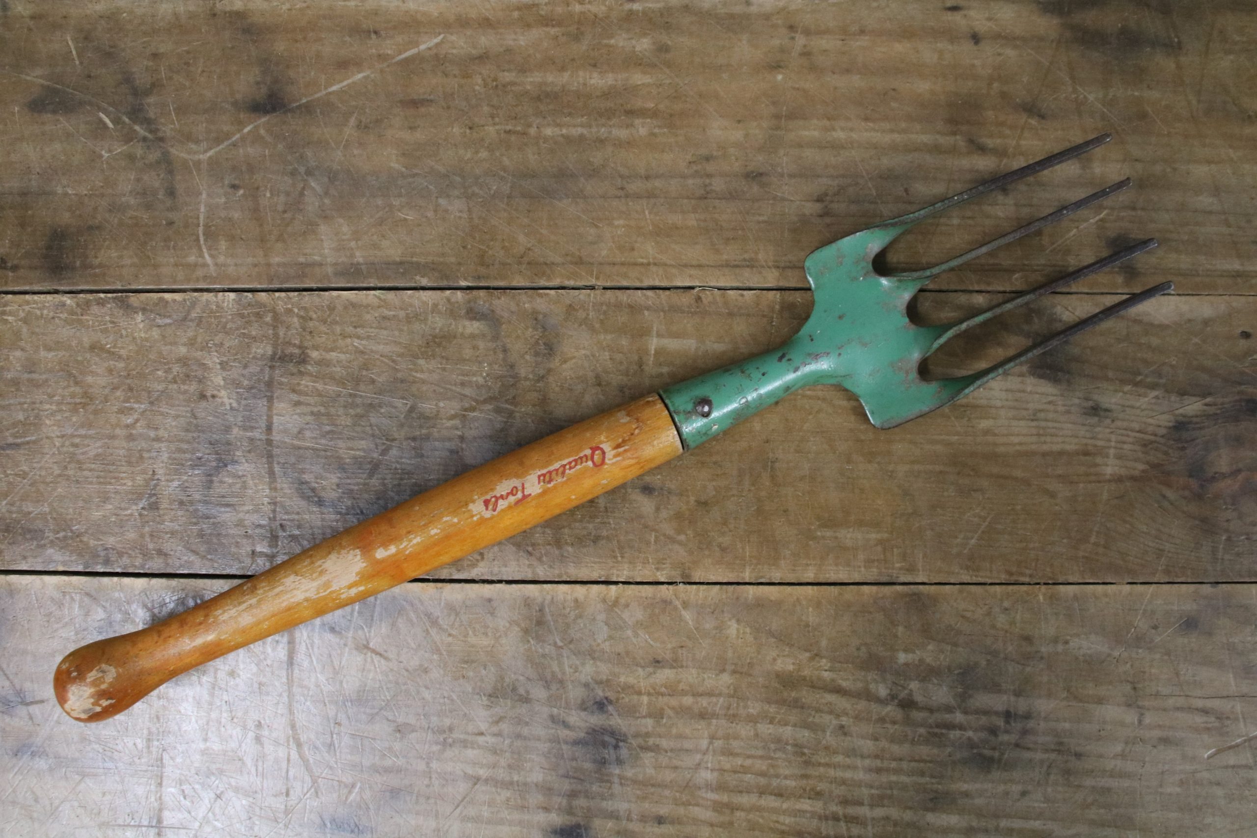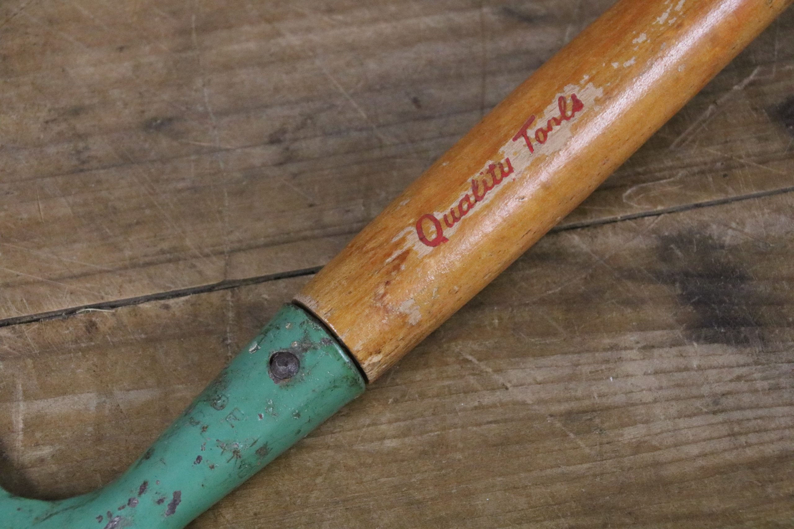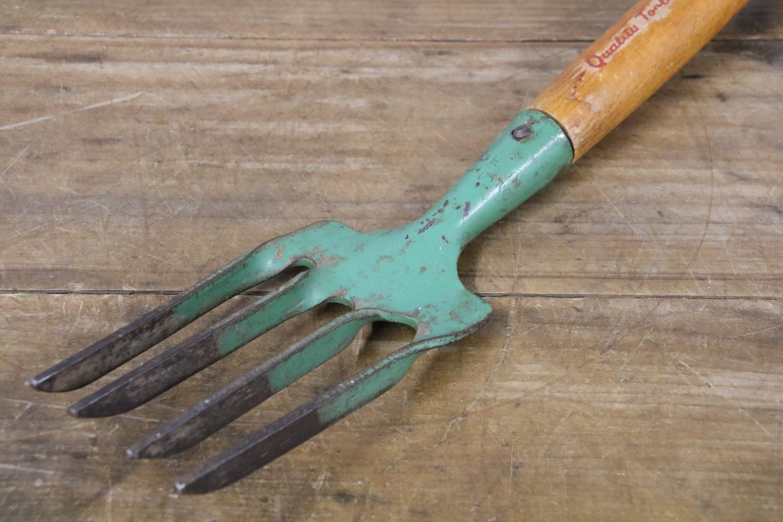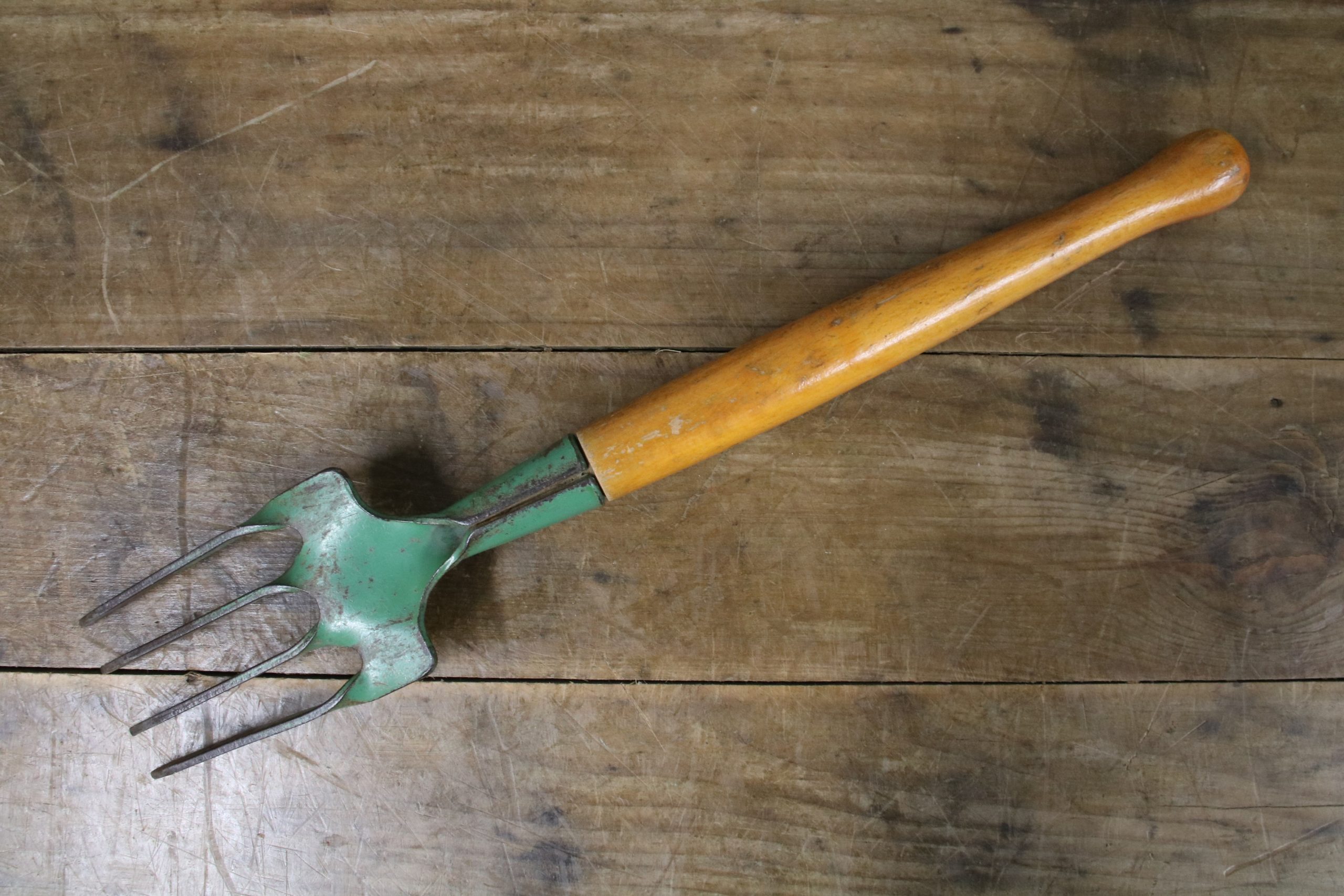This vintage hand fork is in very good condition with a long waxed wooden handle. It has distressed green paint with a ‘Made in England’ stamp on the metal work and ‘Quality Tools’ on the wooden handle.