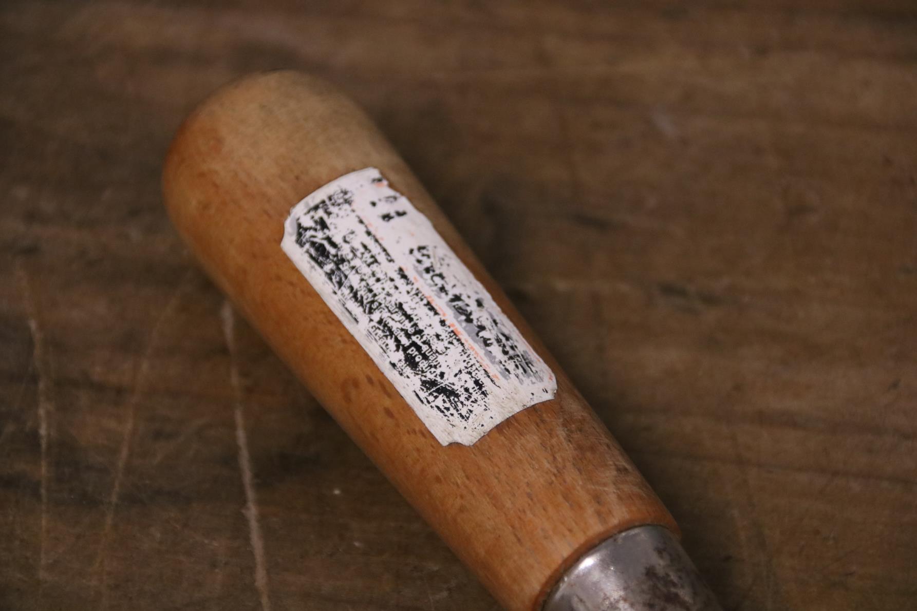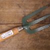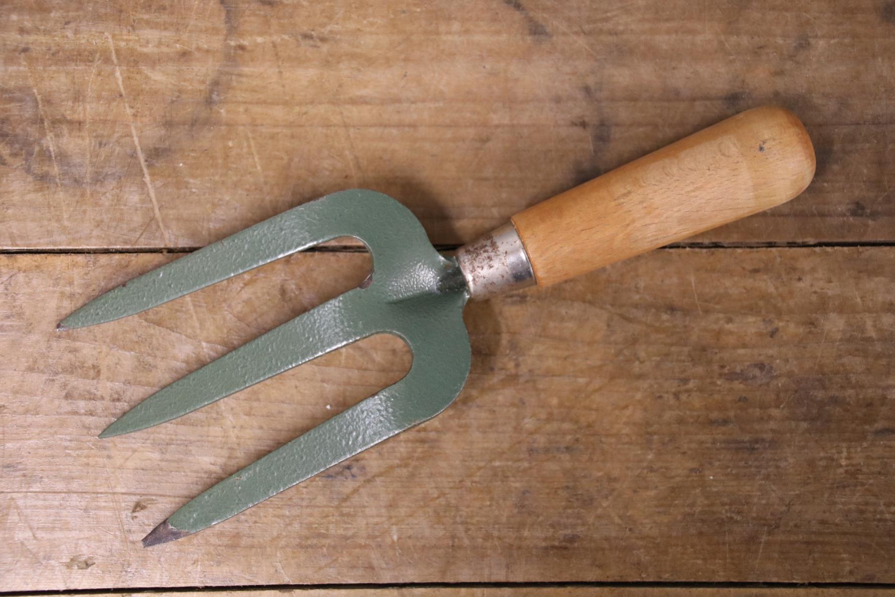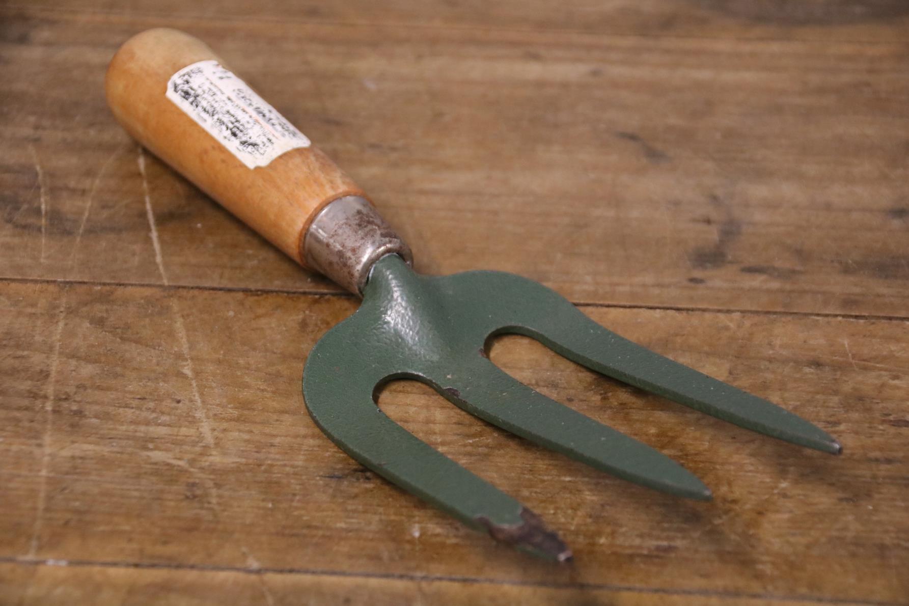 This vintage hand fork is in very good condition with a beautiful waxed wooden handle. The green painted metal prongs have a distressed look to them and there is a label remnant on the handle.