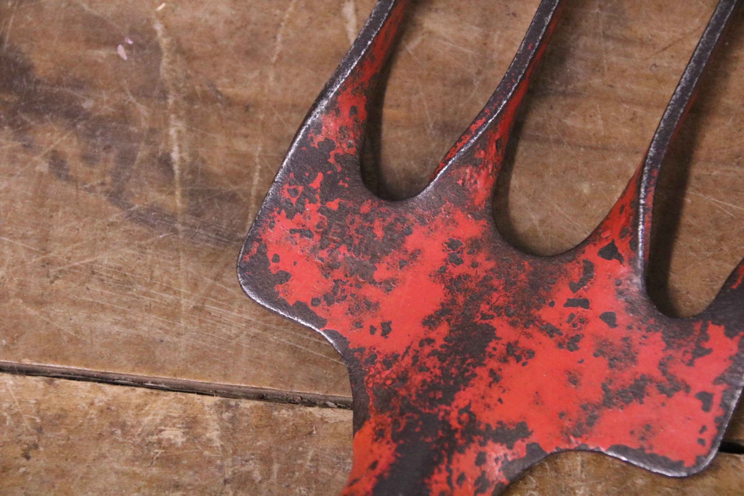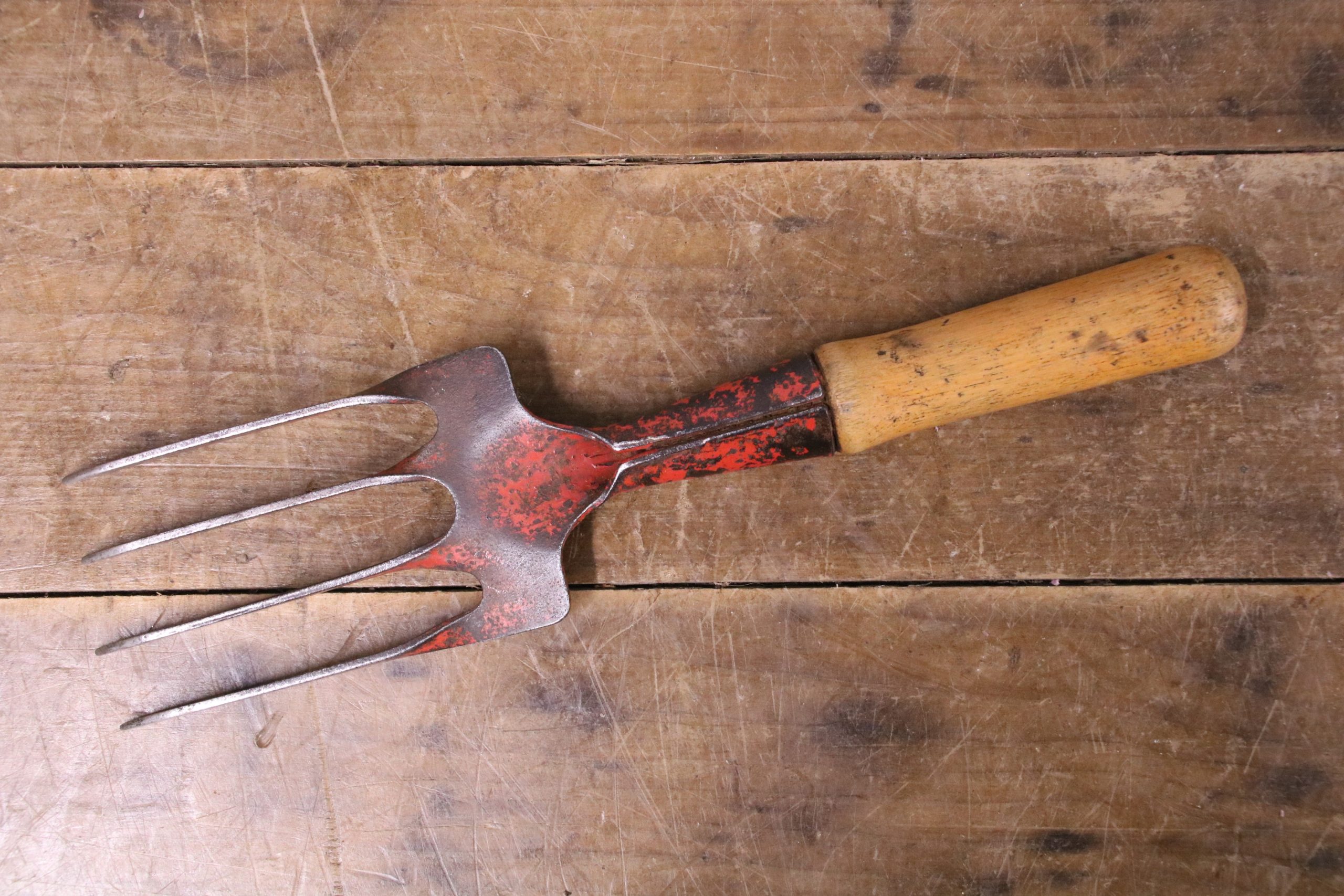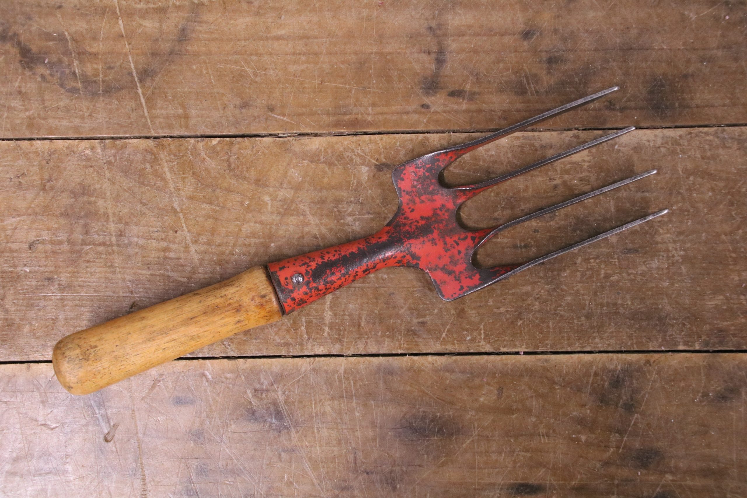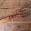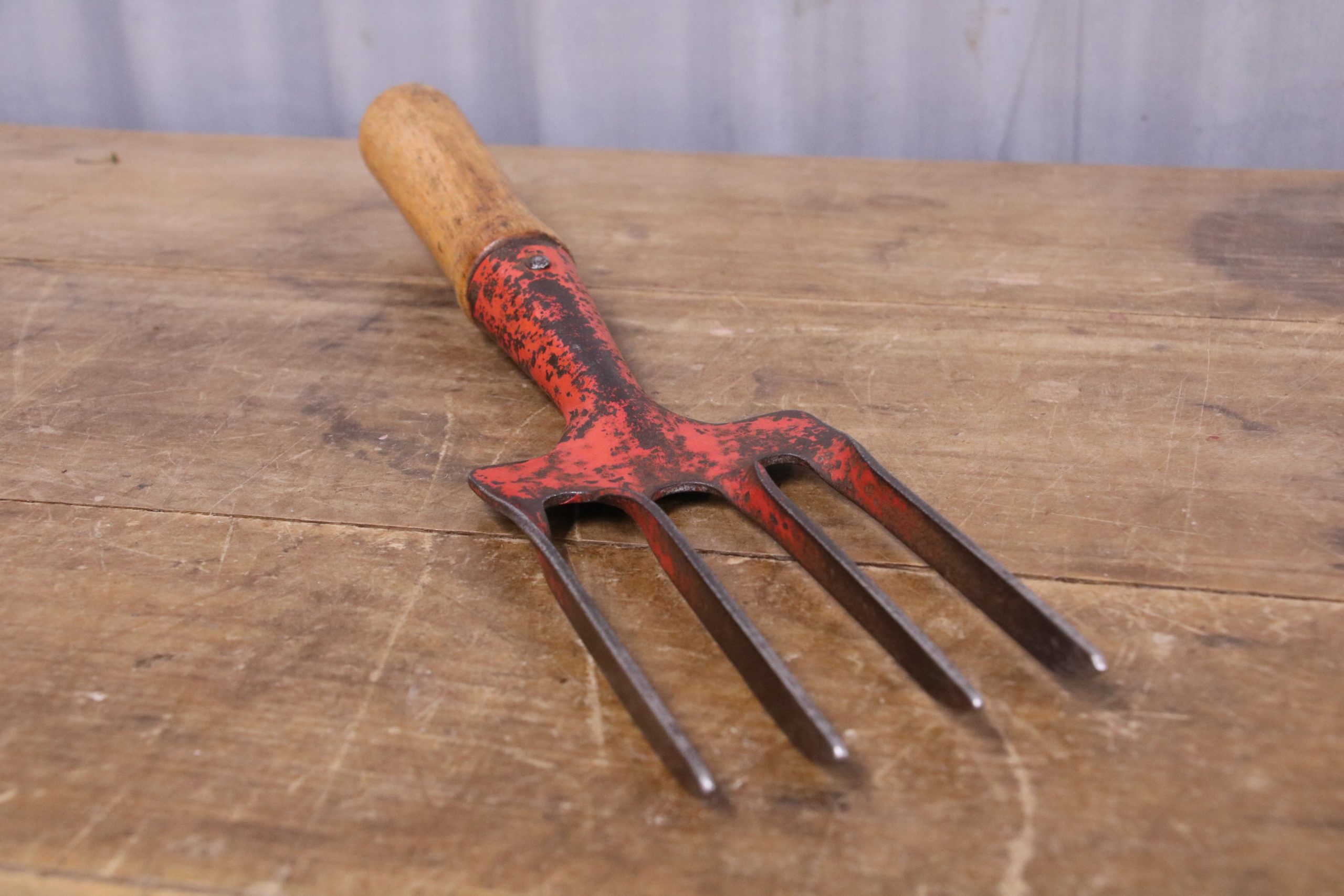 This vintage hand fork is in very good condition with a waxed wooden handle. The metal prongs have distressed red paint on them and there is a stamp which reads ‘Made in England.’