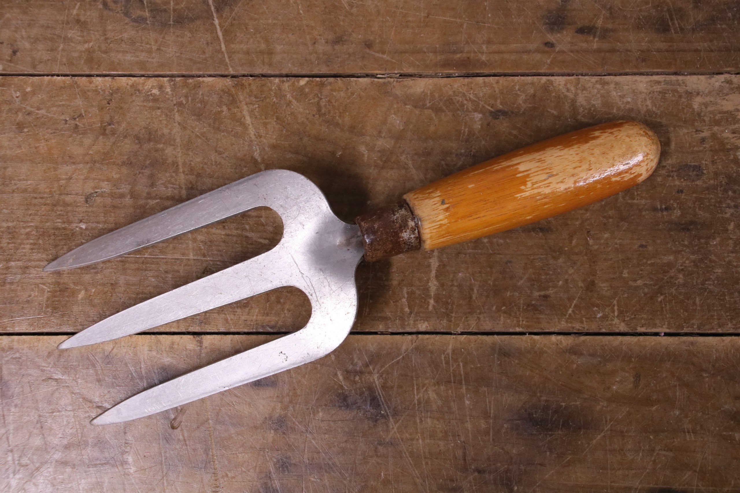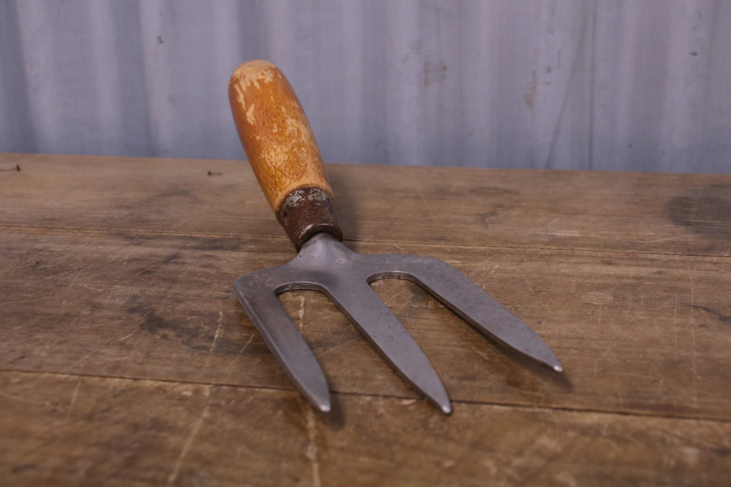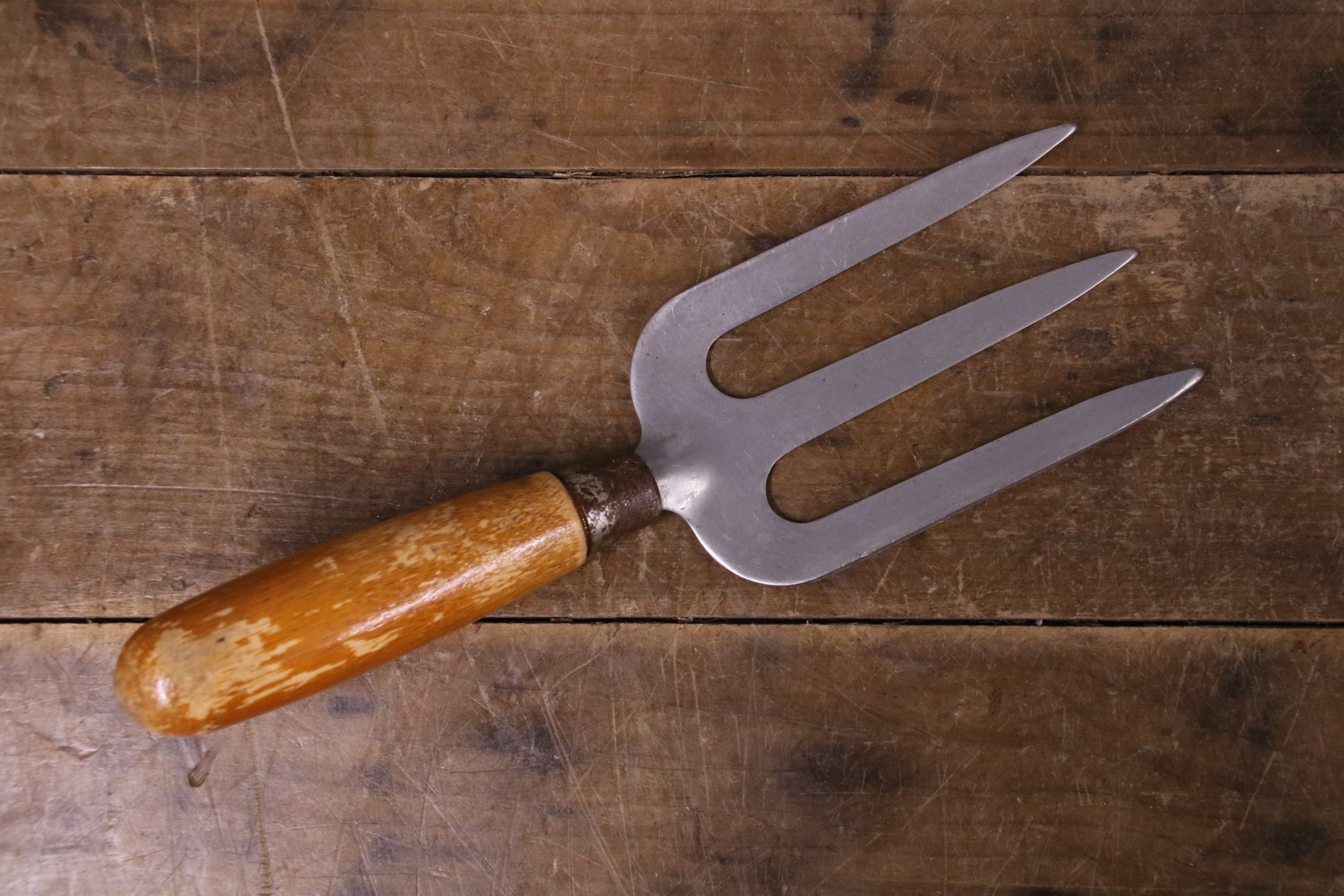 This vintage hand fork is in very good condition with a waxed wooden handle.