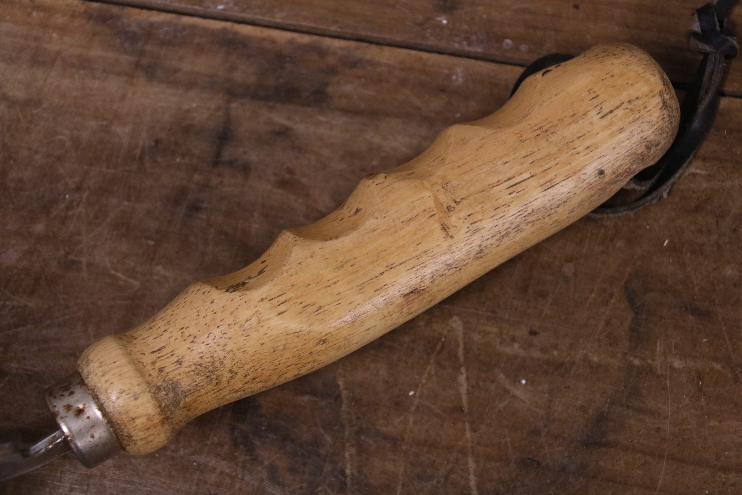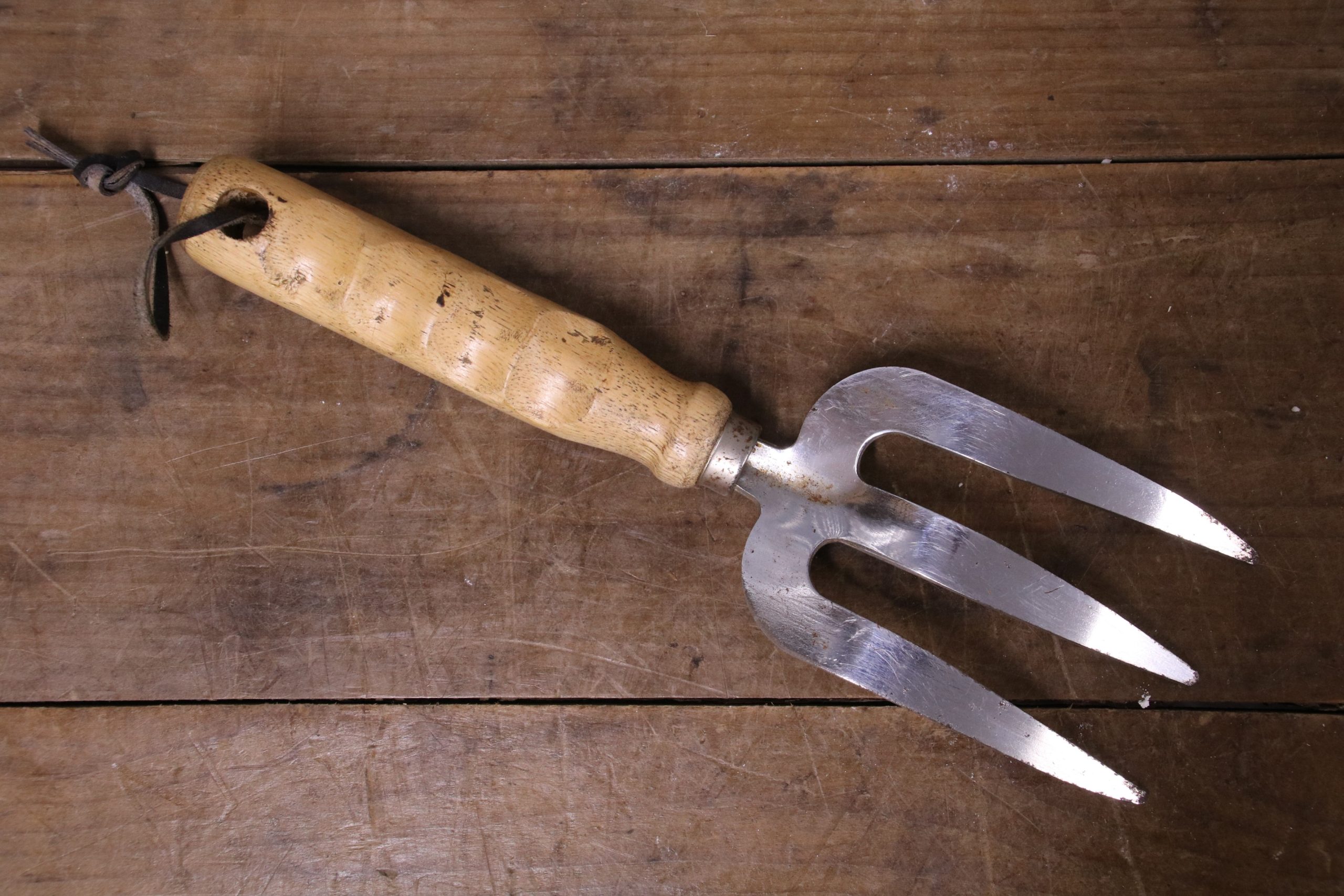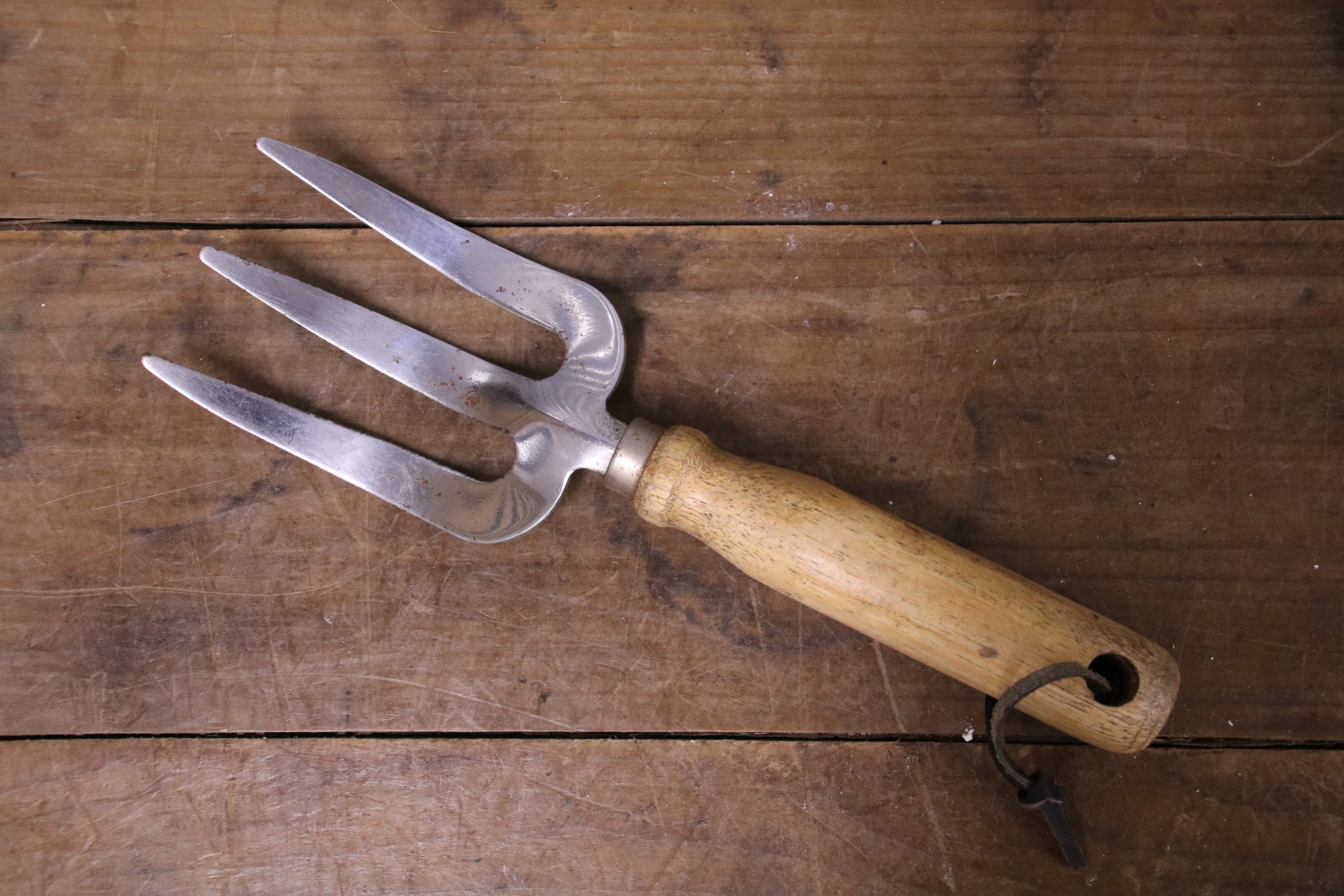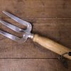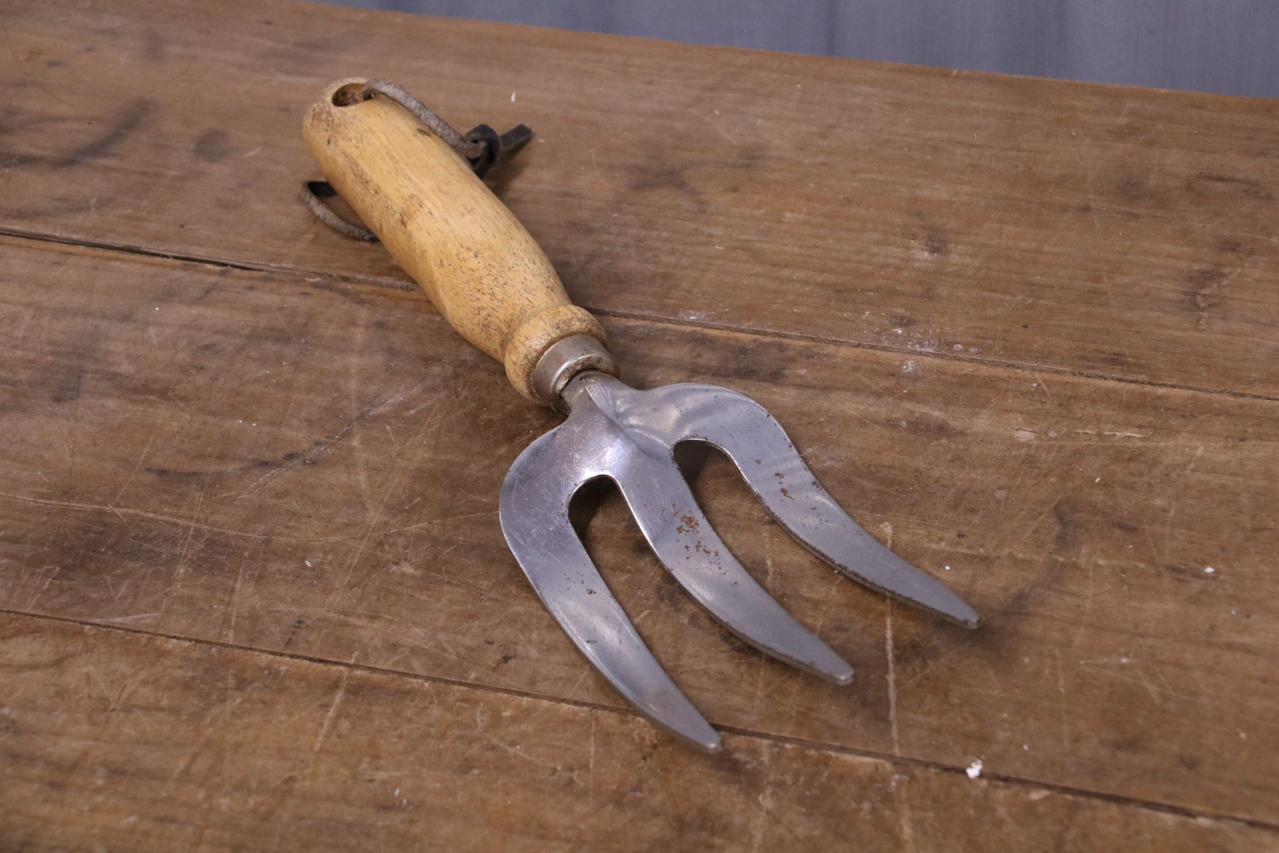 This vintage hand fork is in very good condition with a waxed wooden ergonimic handle. It is stainless steel with a shaped wooden handle.