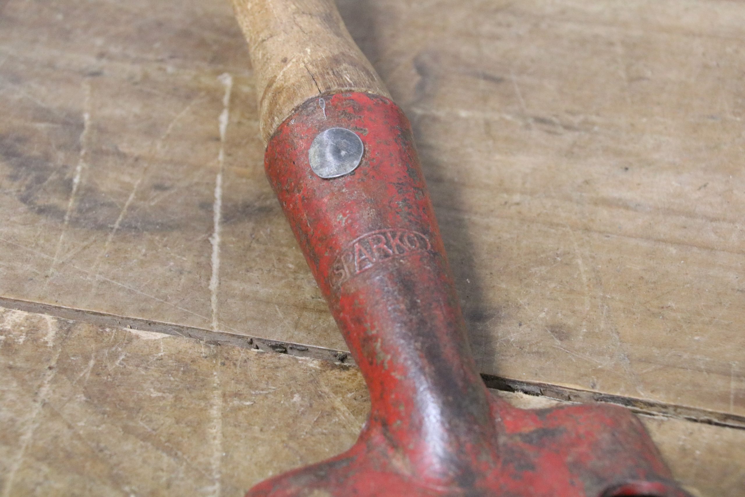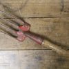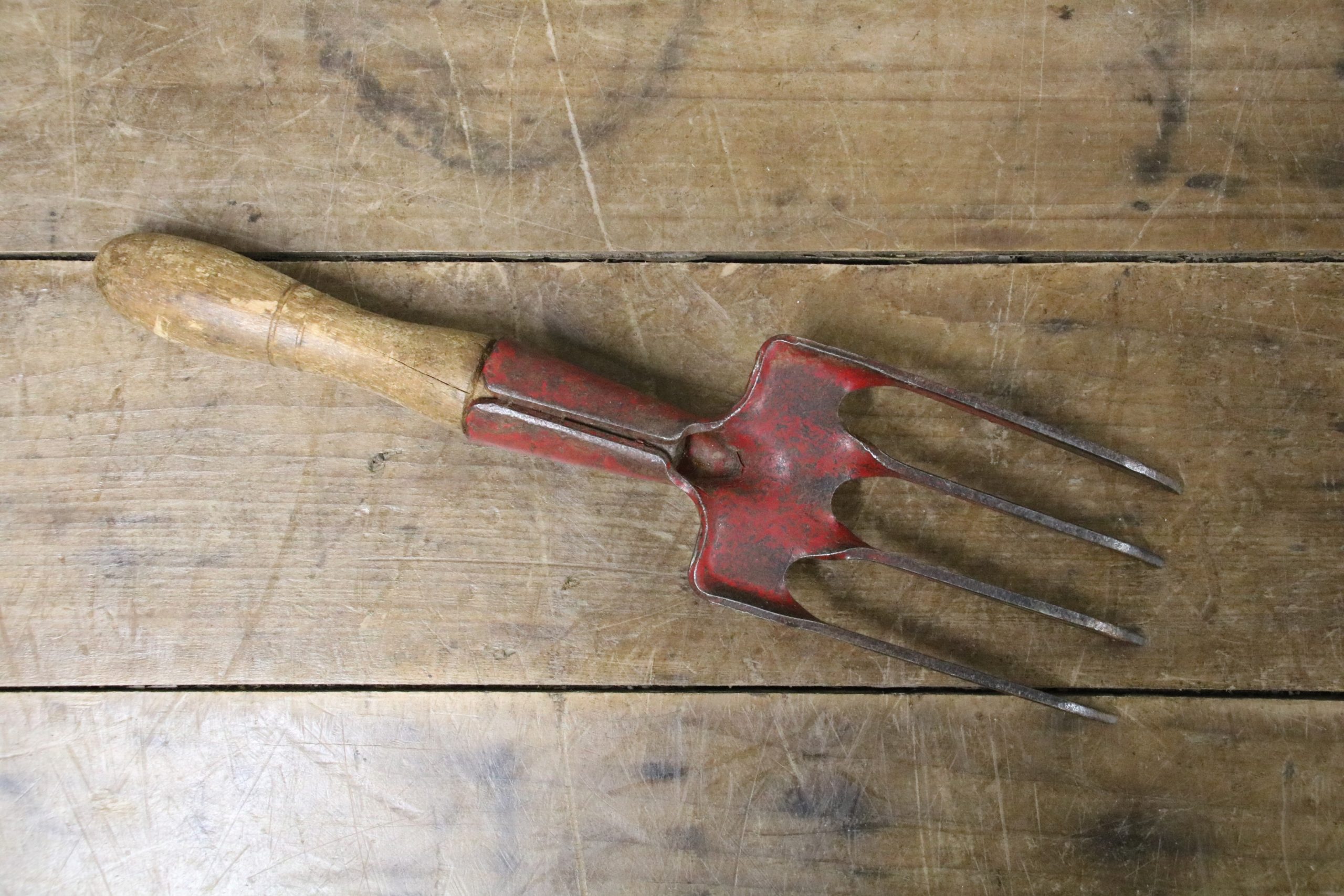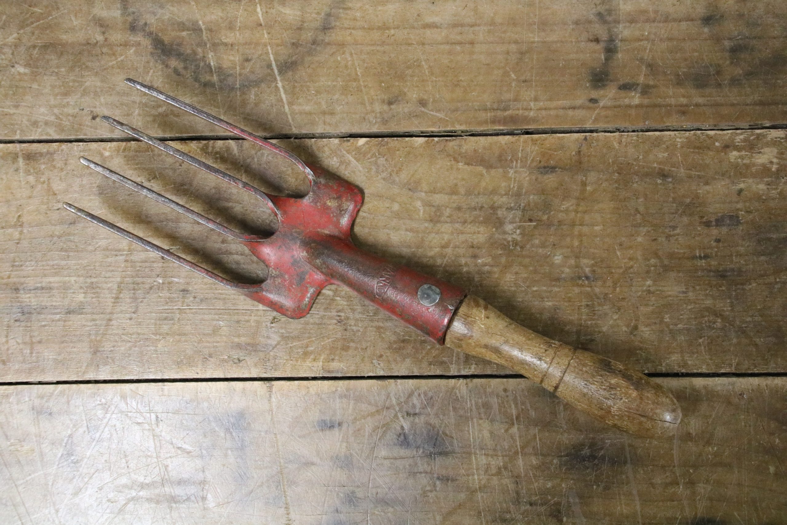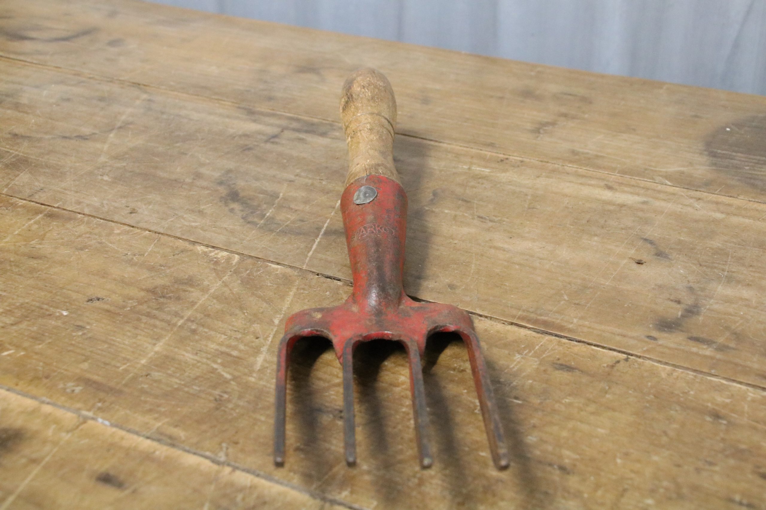 This vintage hand fork is in very good condition with a waxed wooden handle. The metal prongs have some red paint remnants on them and a stamp reads ‘Sparko’.