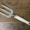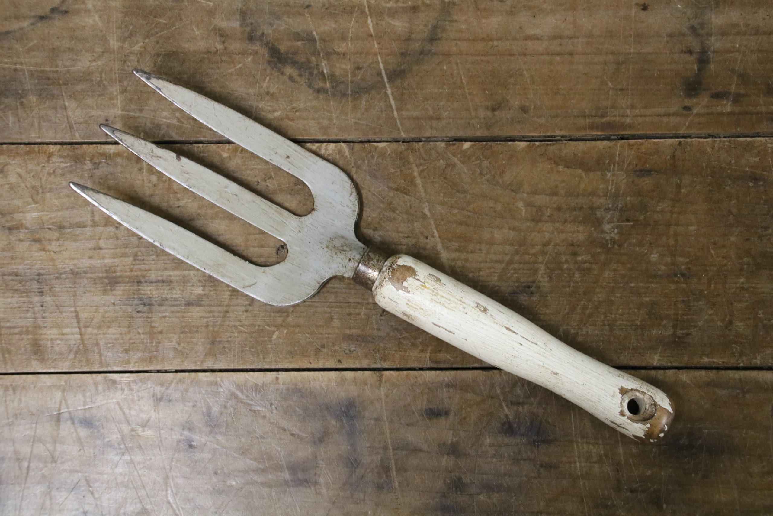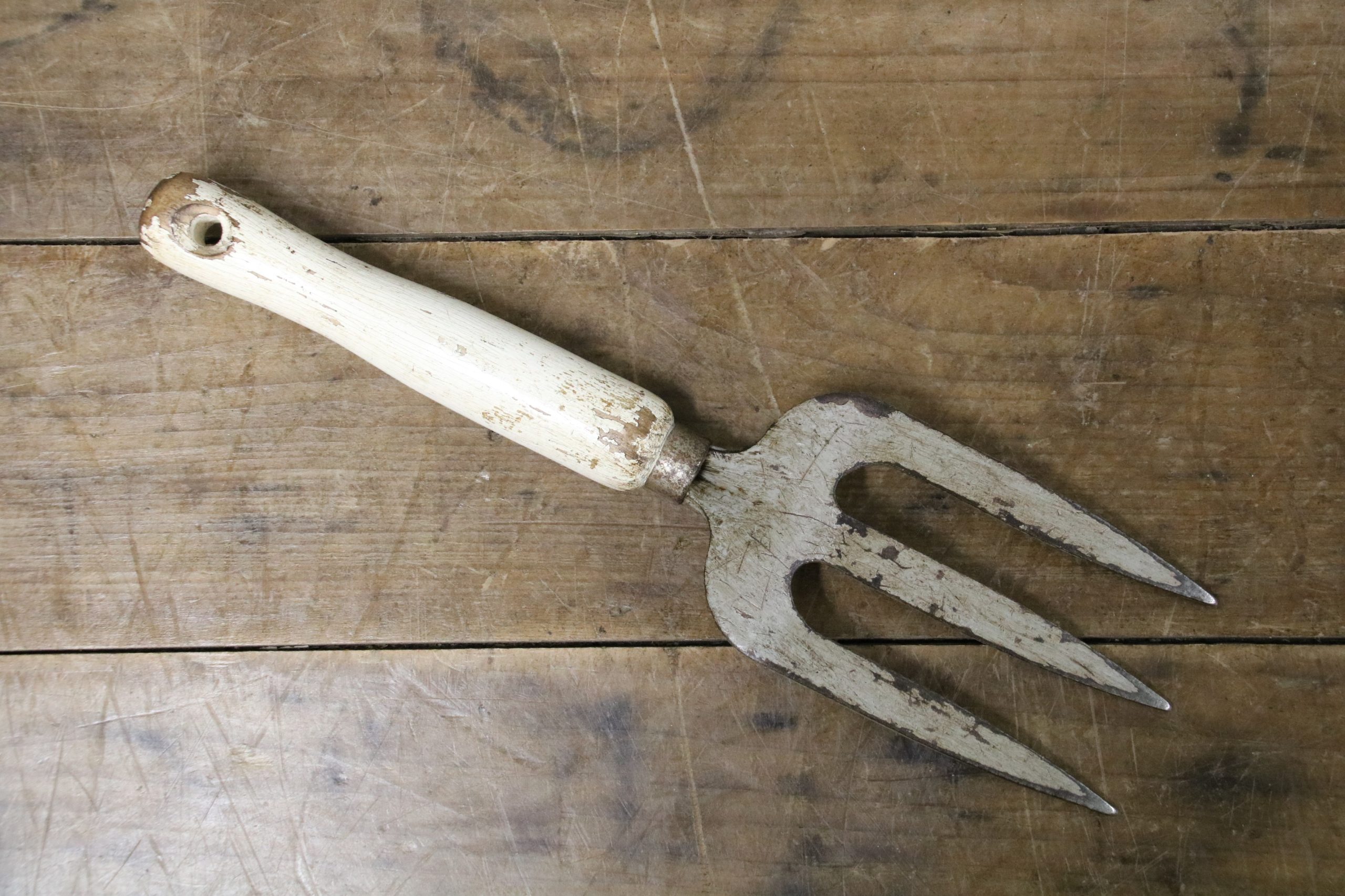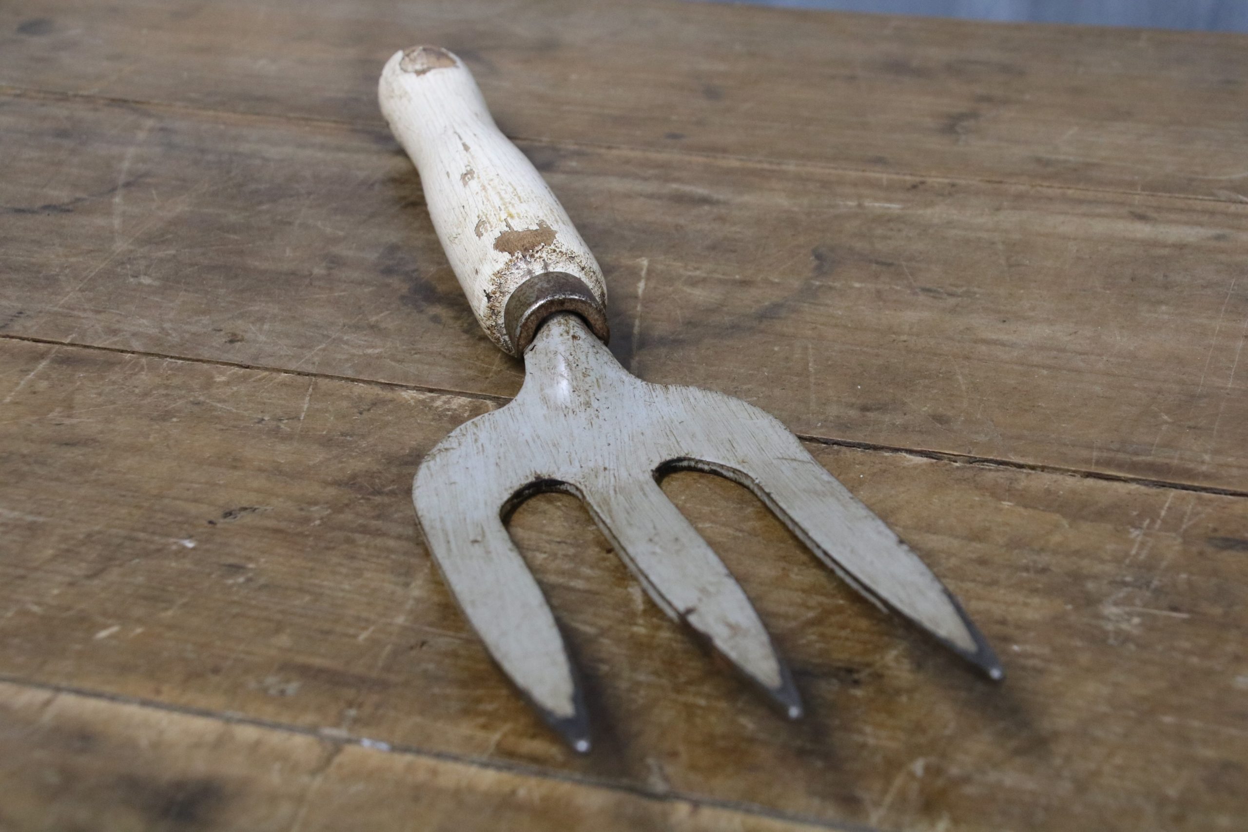 This vintage hand fork is in very good condition with a white distressed waxed wooden handle. The metal prongs have some grey paint remnants on them.