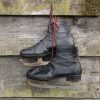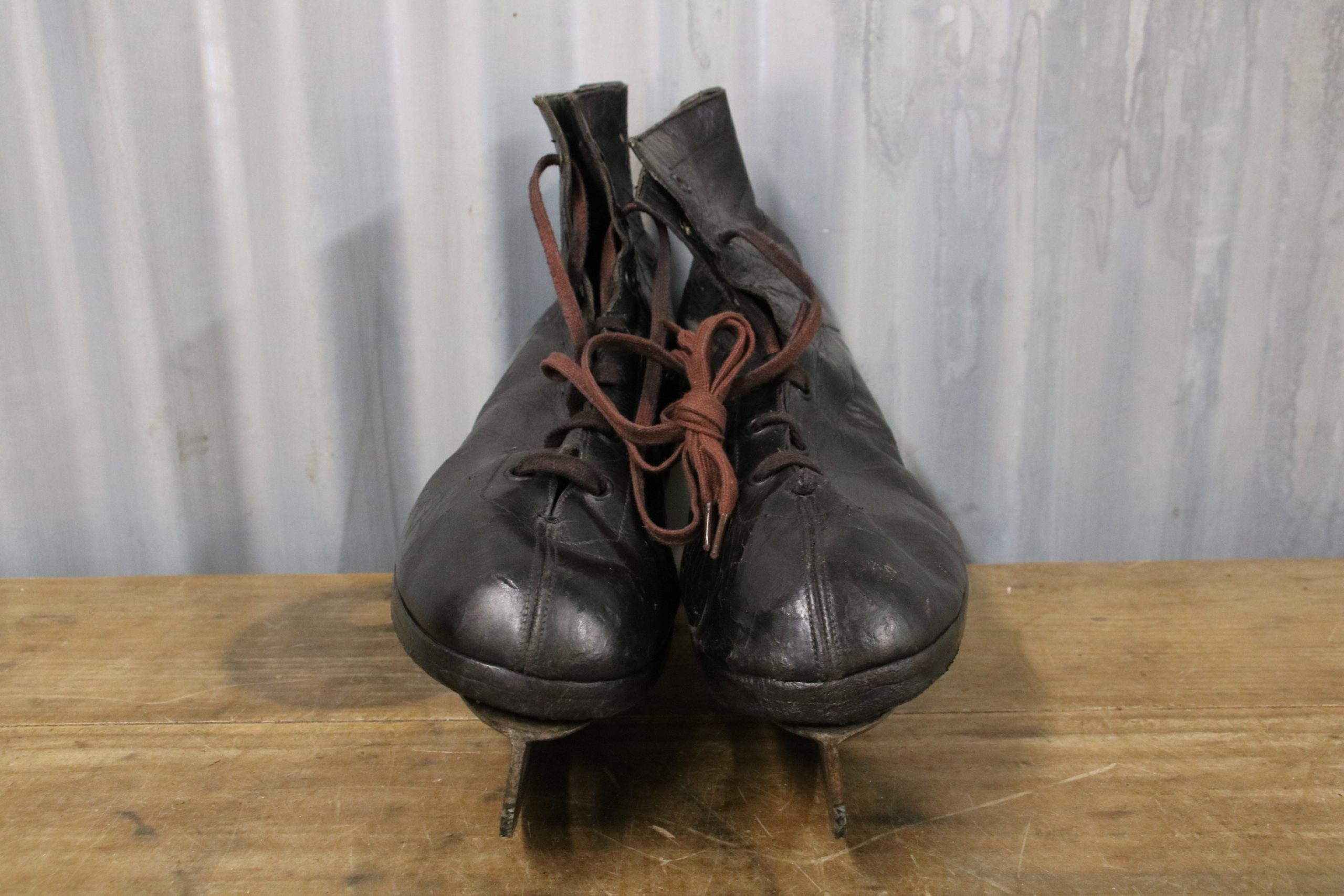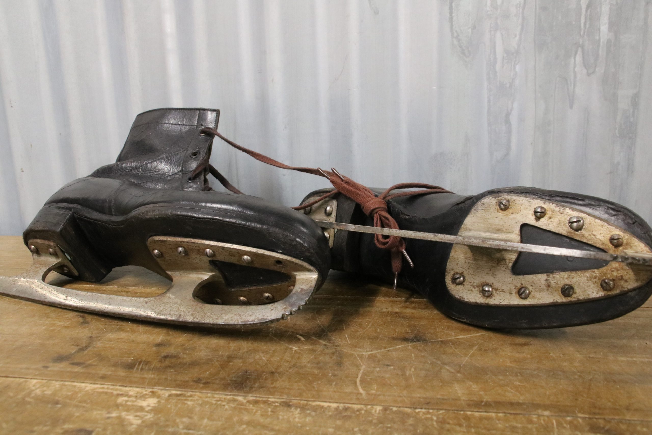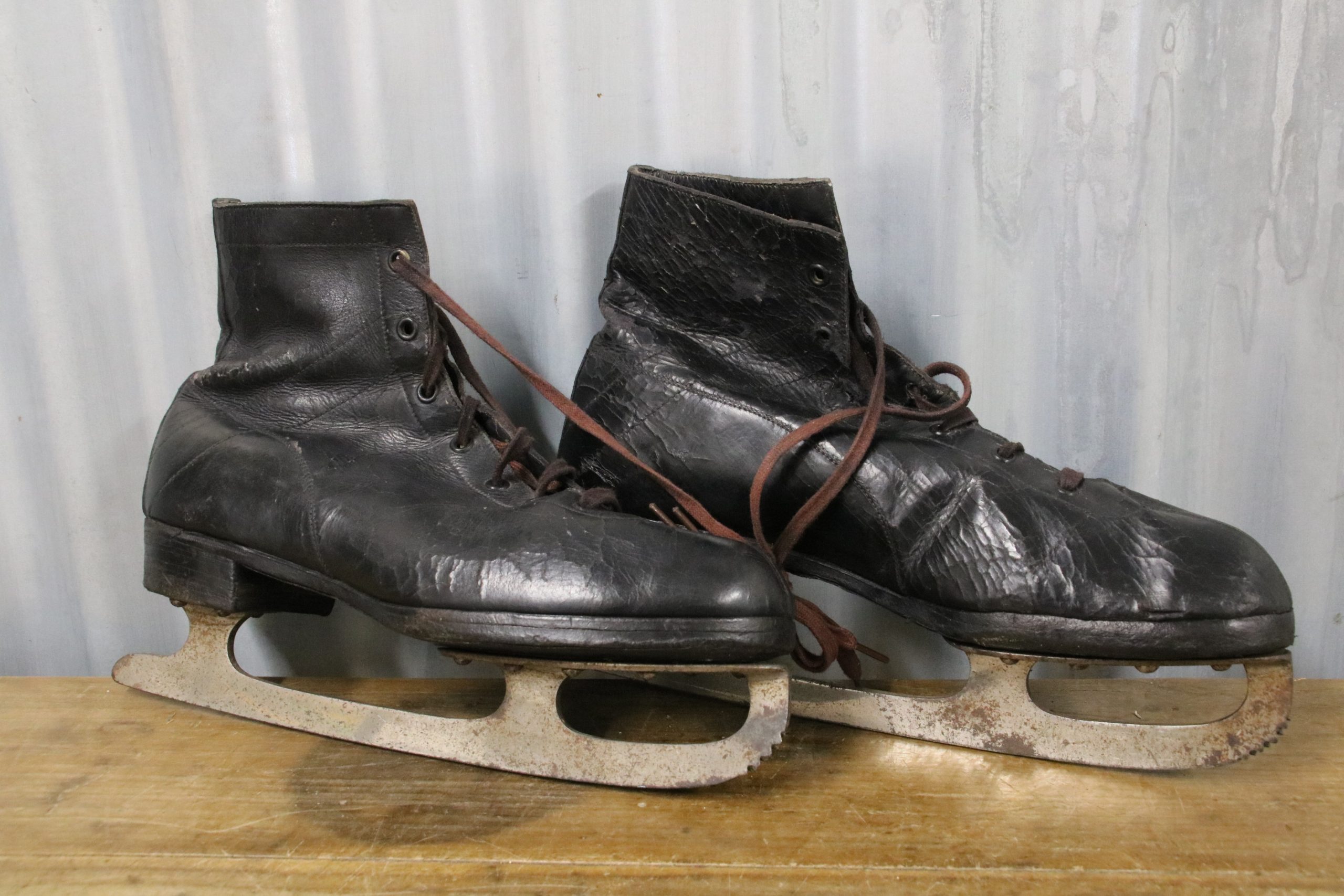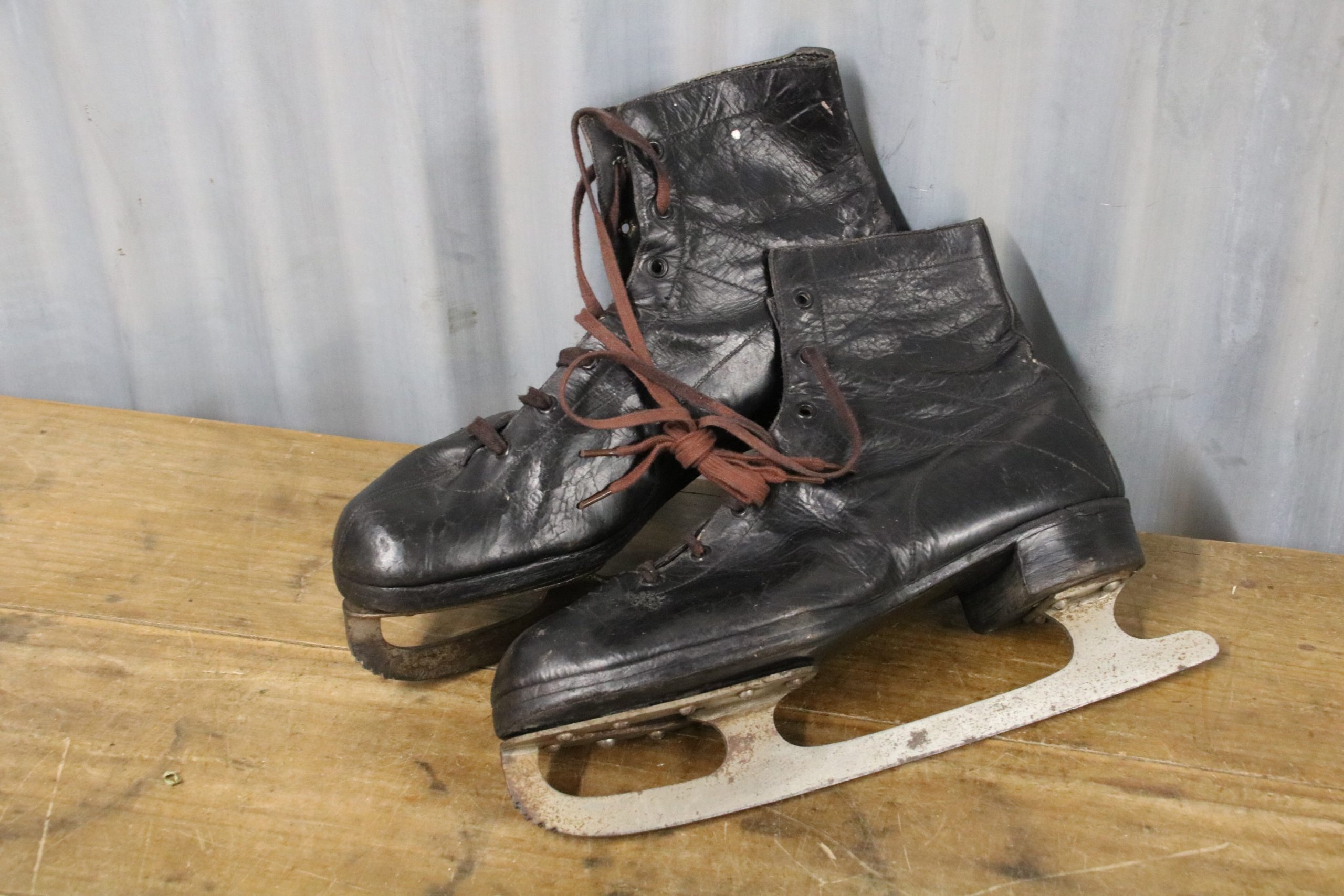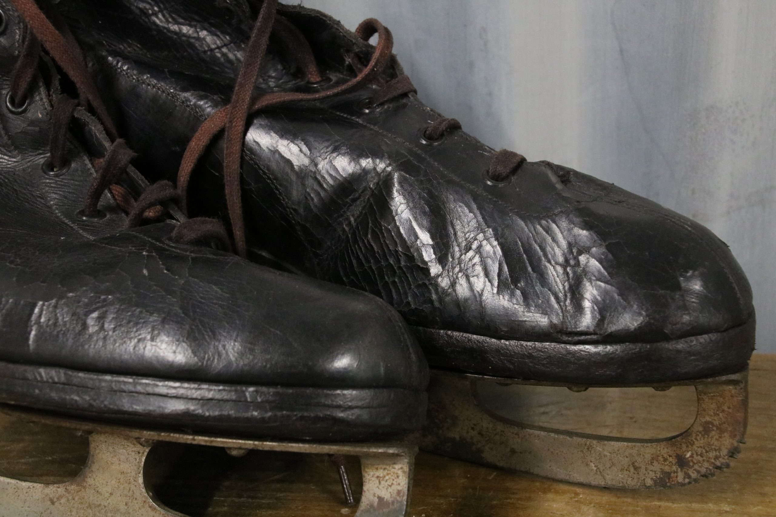 The skates are in very good condition with a few marks and stains due to age. The black leather is cracked in places and shows signs of wear over the years, a couple of eyelets have also torn open. The metal blade has been polished.
