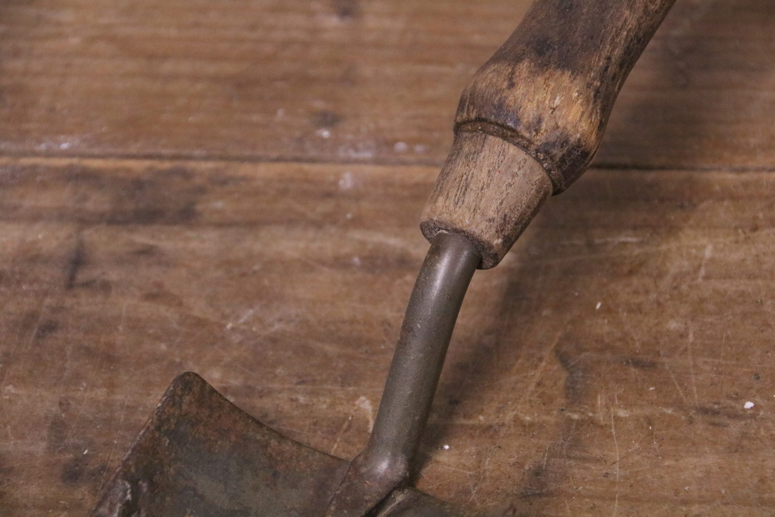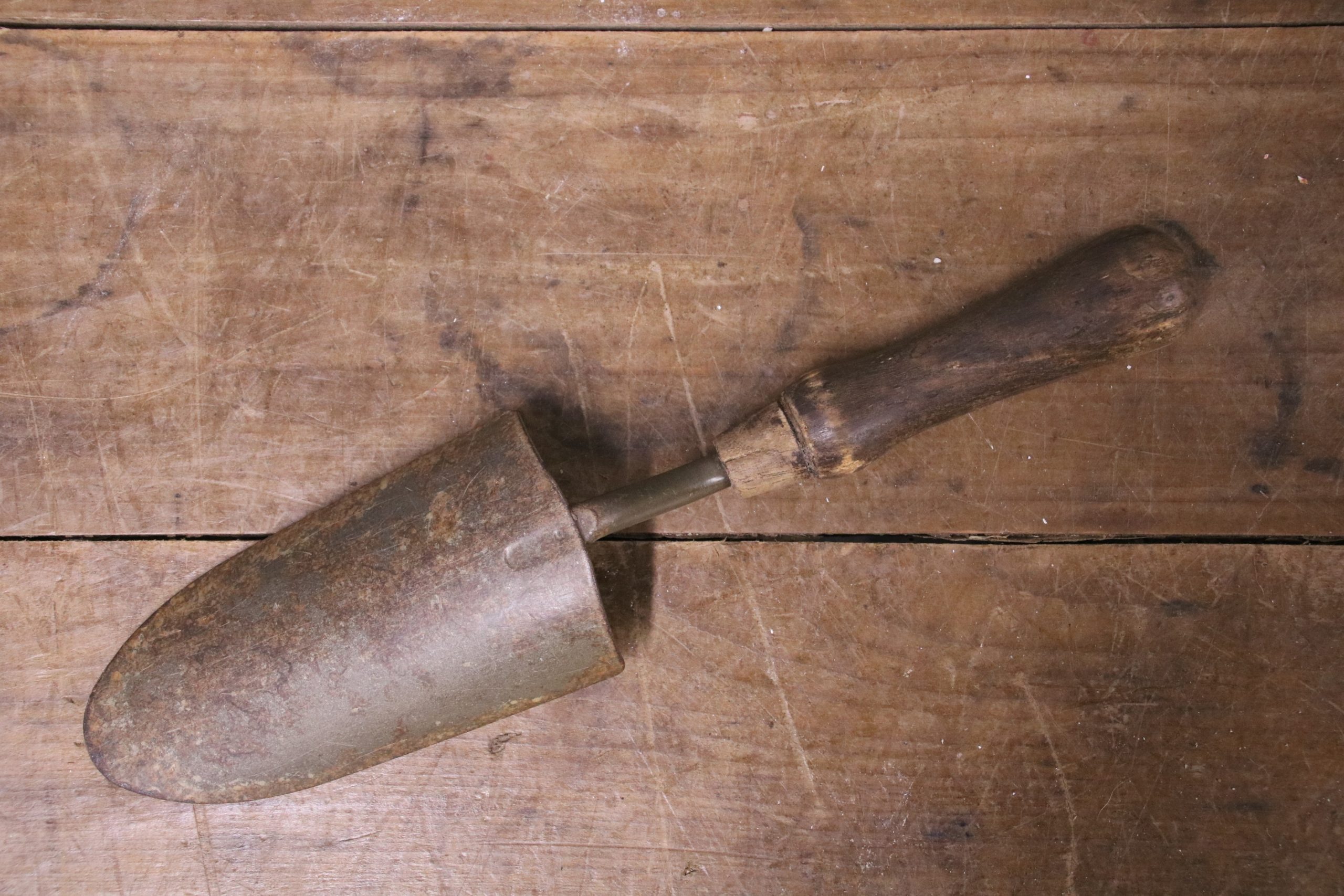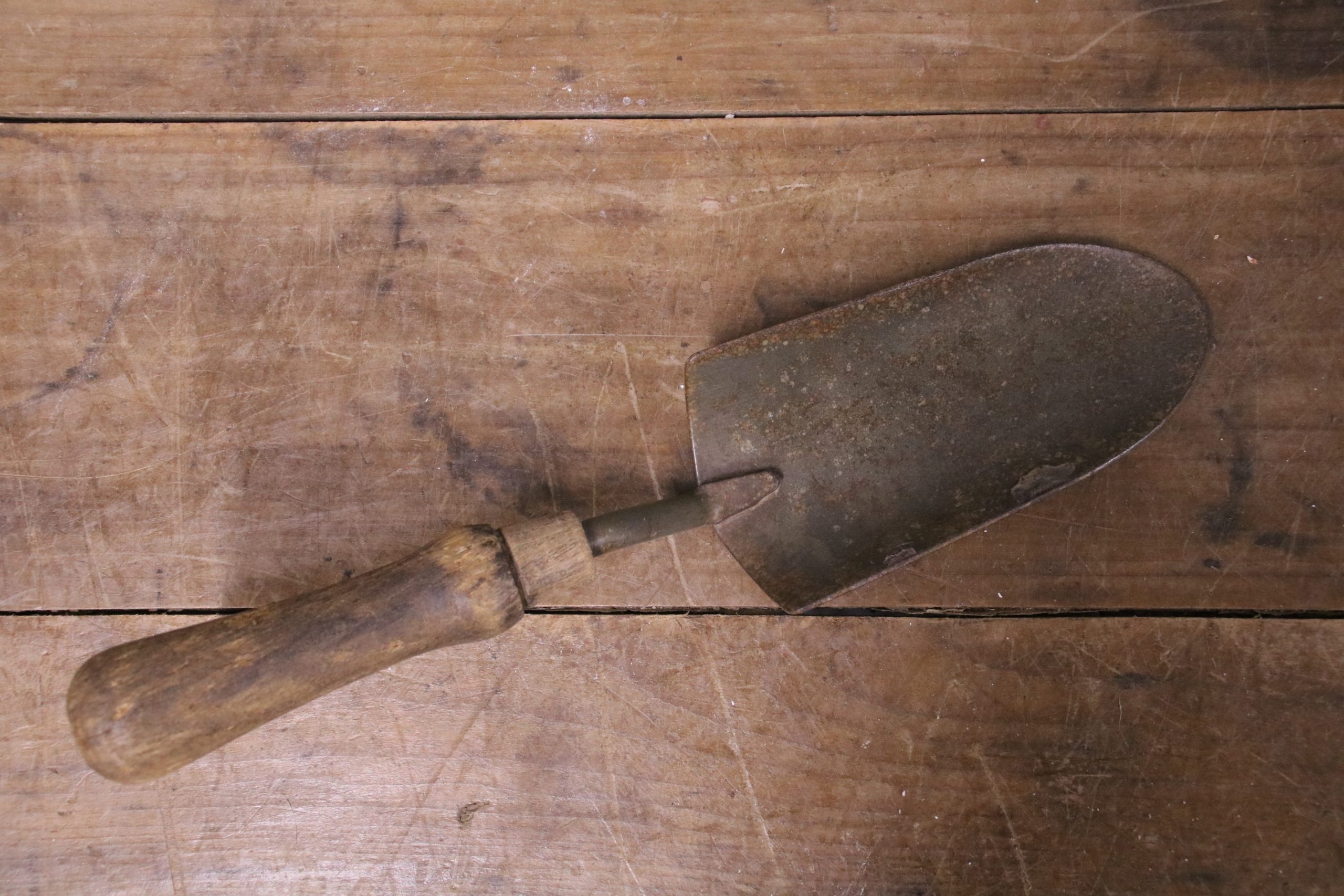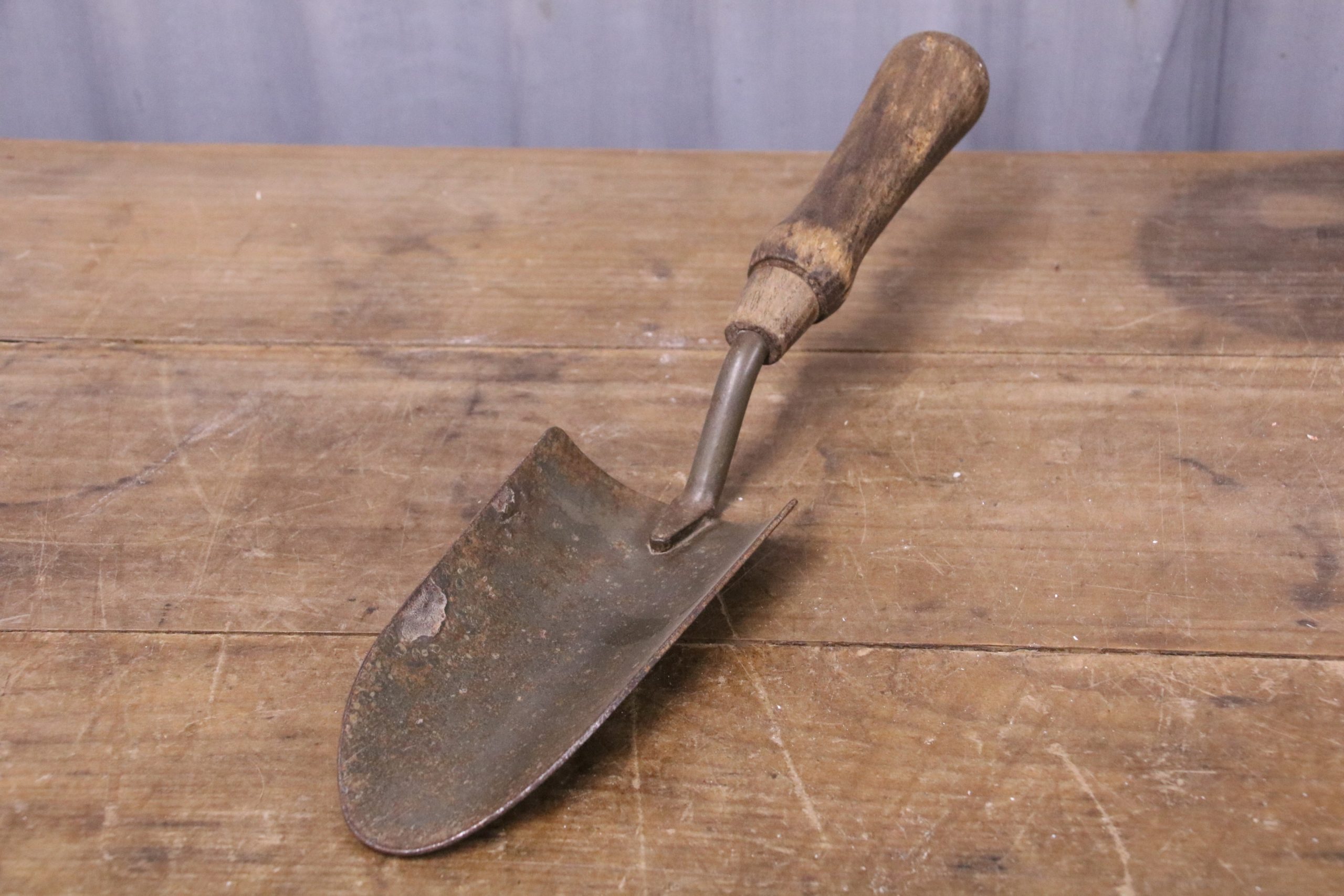 This vintage trowel is in very good condition with a waxed wooden handle. The metal work has some marks and stains, and the ring cap is missing but doesn’t effect the use.