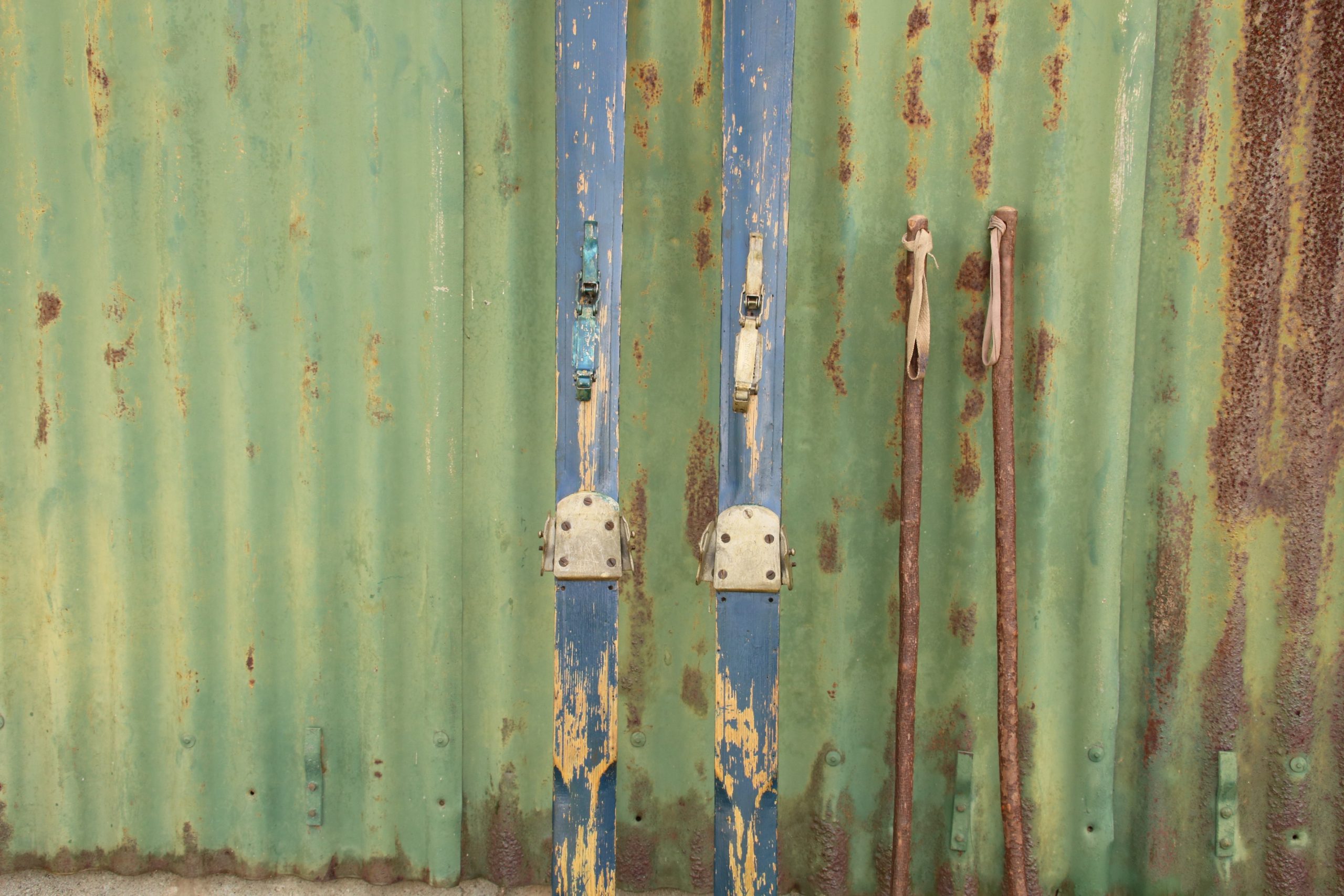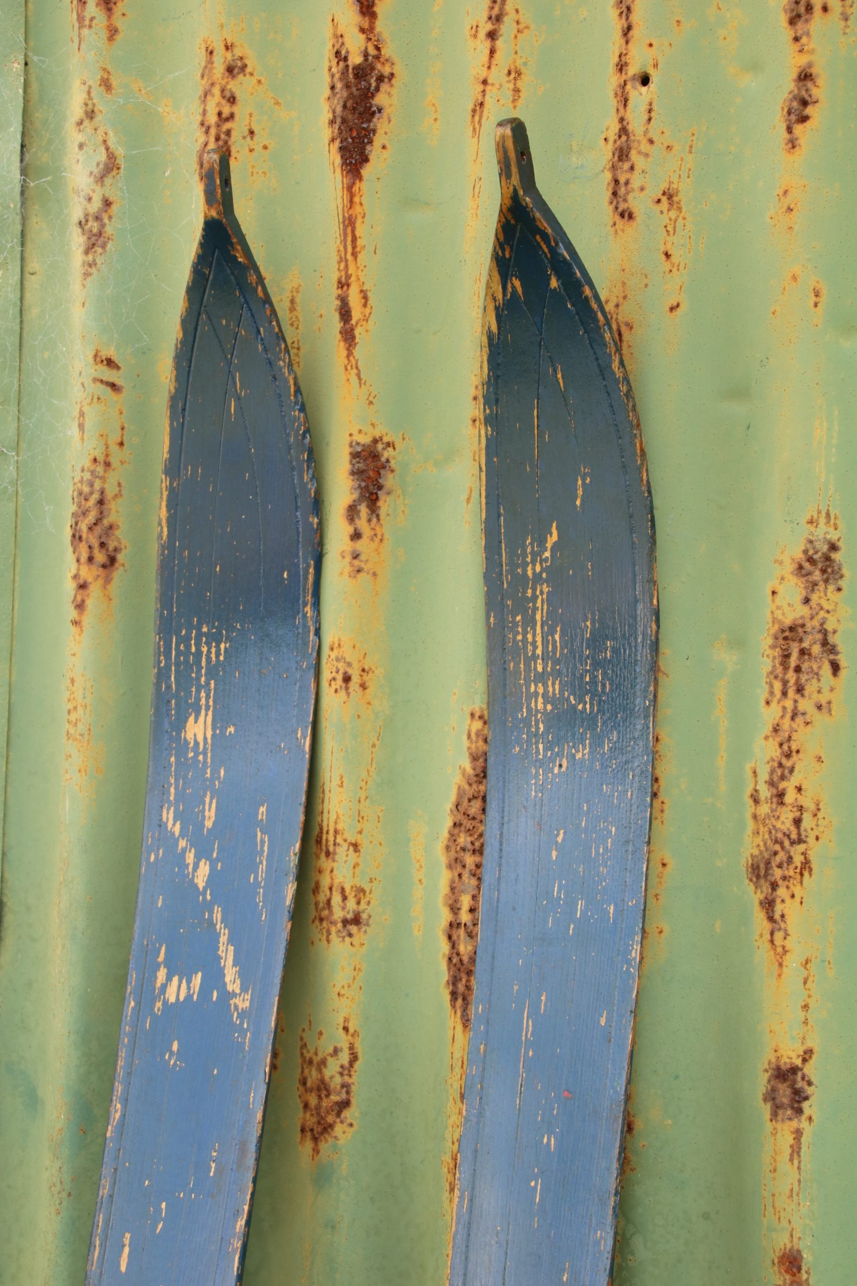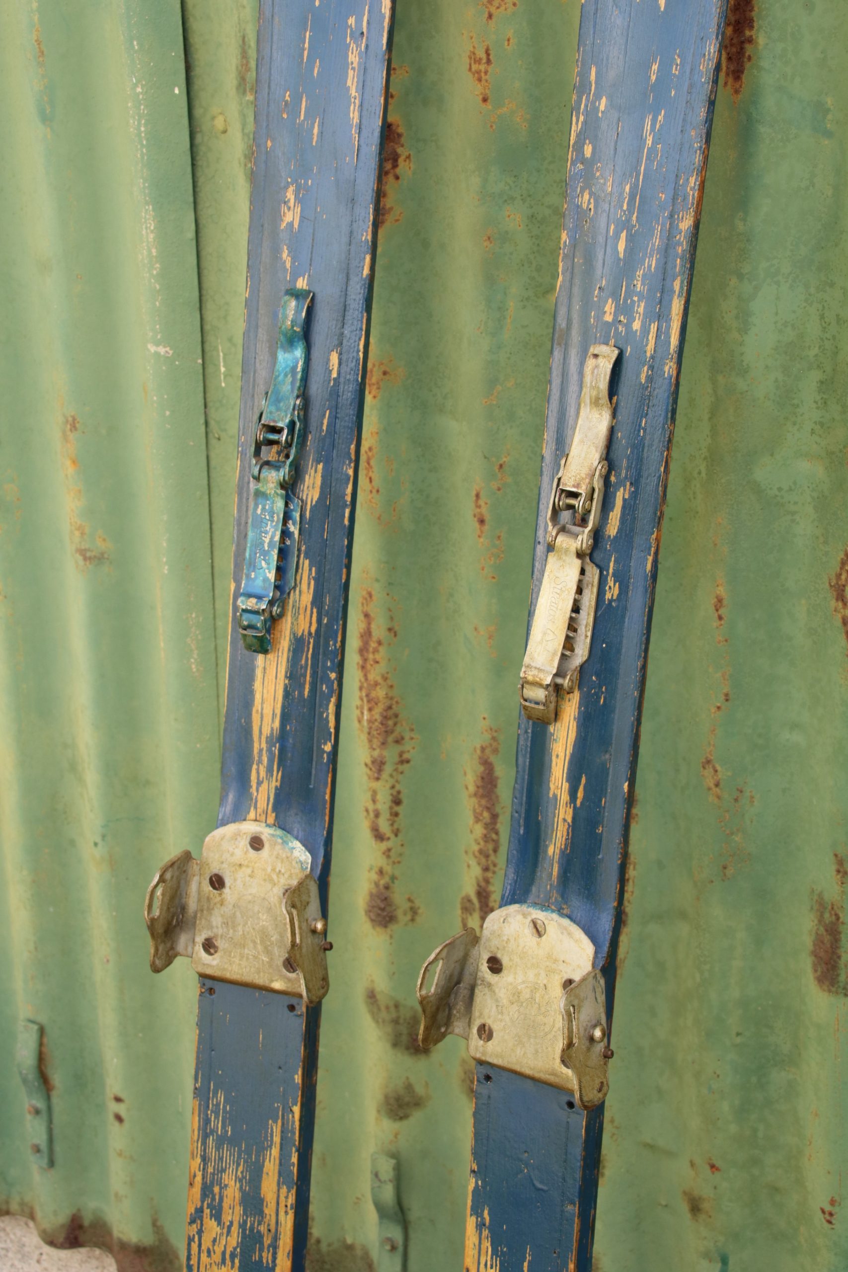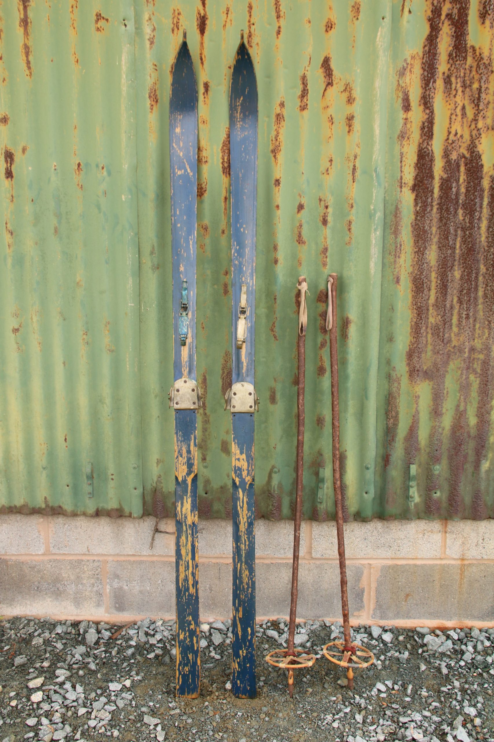 The skis are in very good, used condition with a few marks and scratches due to age. They have distressed blue paint and no foot straps.
