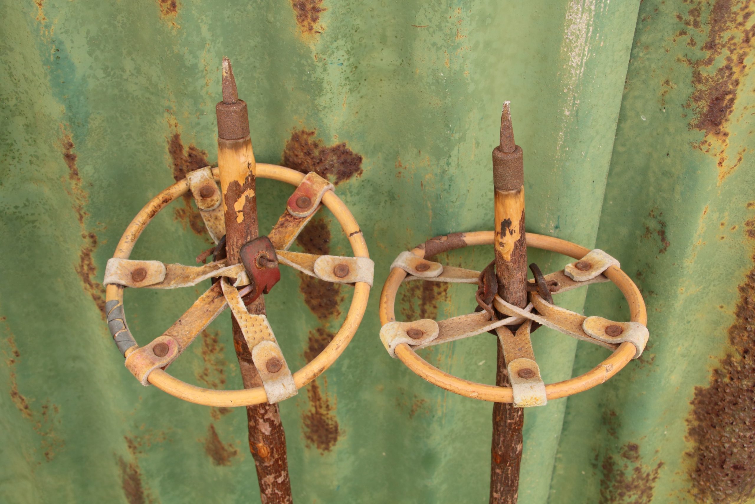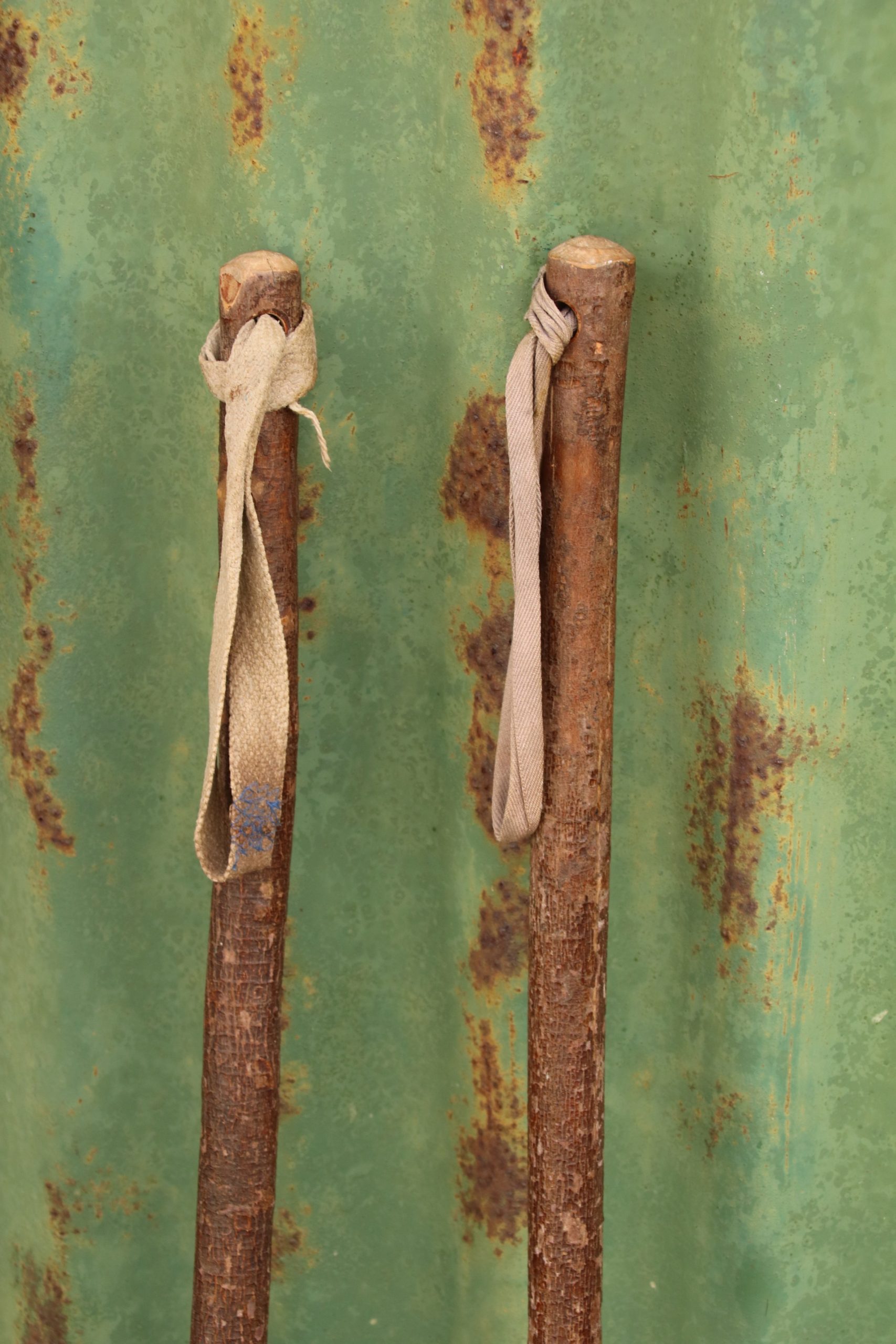 The poles are made from tree branches and are in very good condition. One of the disc leather straps is broken.