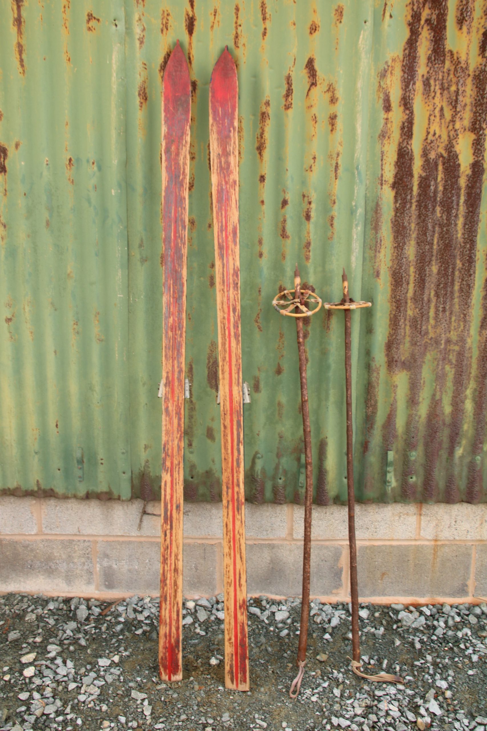 A set of antique wooden skis complete with poles. Perfect for decorative purposes, at home or in a shop display.