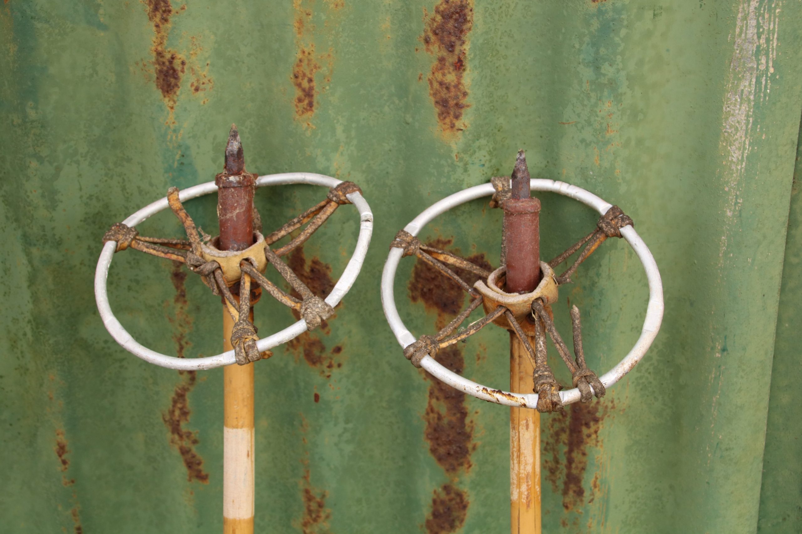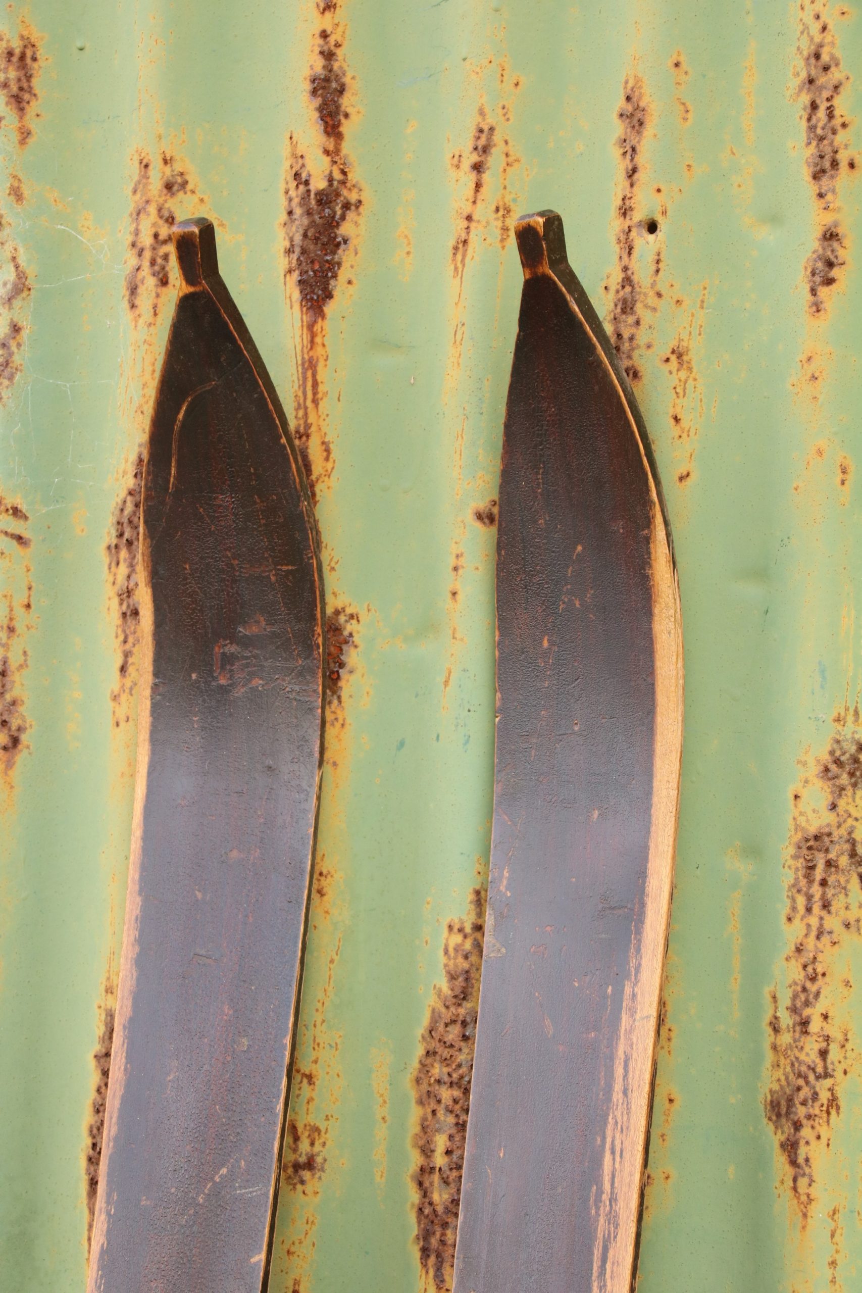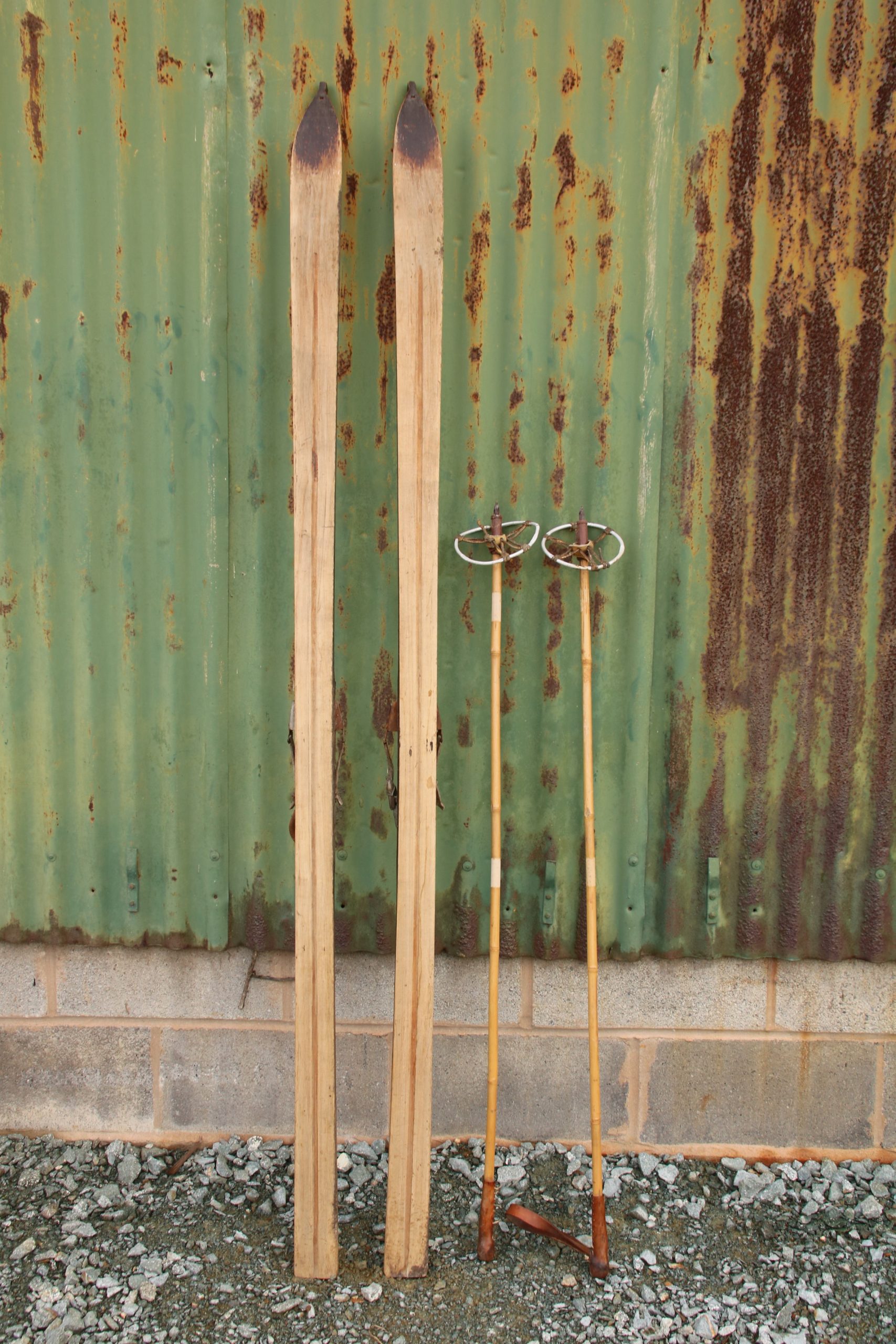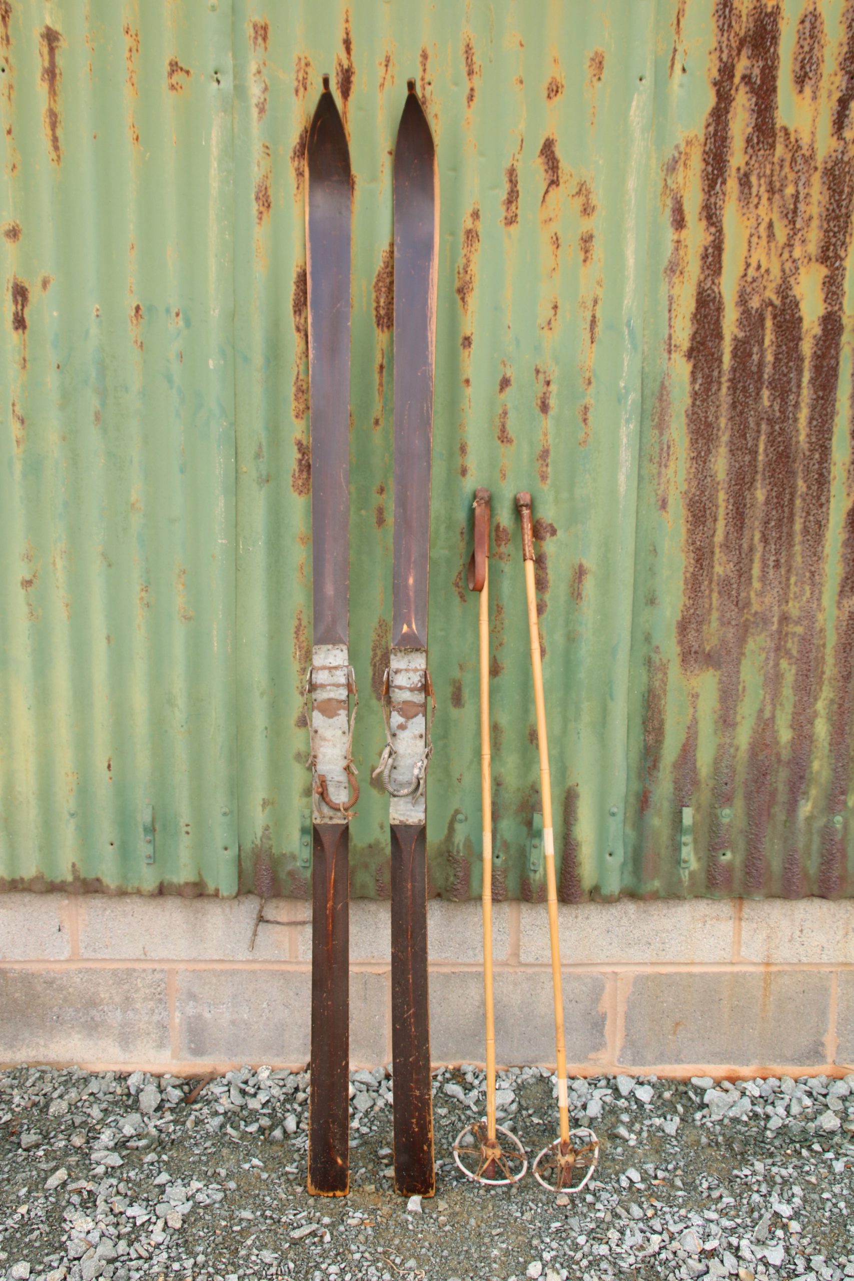 A set of antique wooden skis complete with poles. Perfect for decorative purposes, at home or in a shop display.