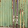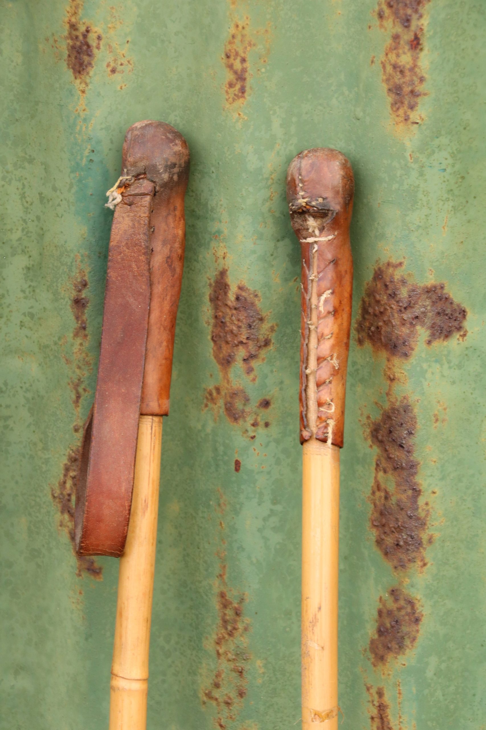 The poles are made from bamboo and are in good condition. The stitching on one handle is coming apart and the strap is missing, and there are some tears on the disc leather straps.