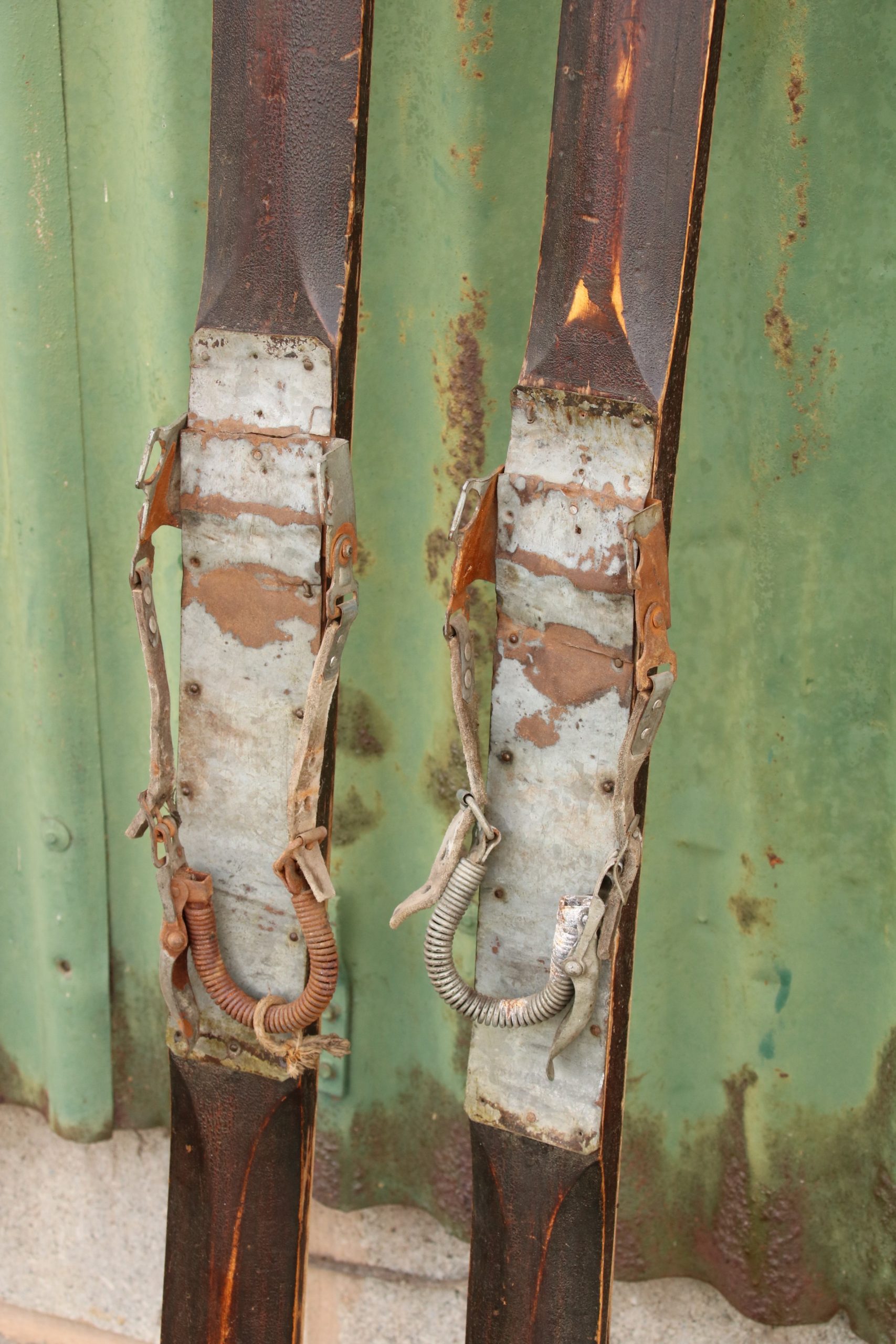 The skis are in very good, used condition with a few marks and scratches due to age. The leather foot straps are missing.