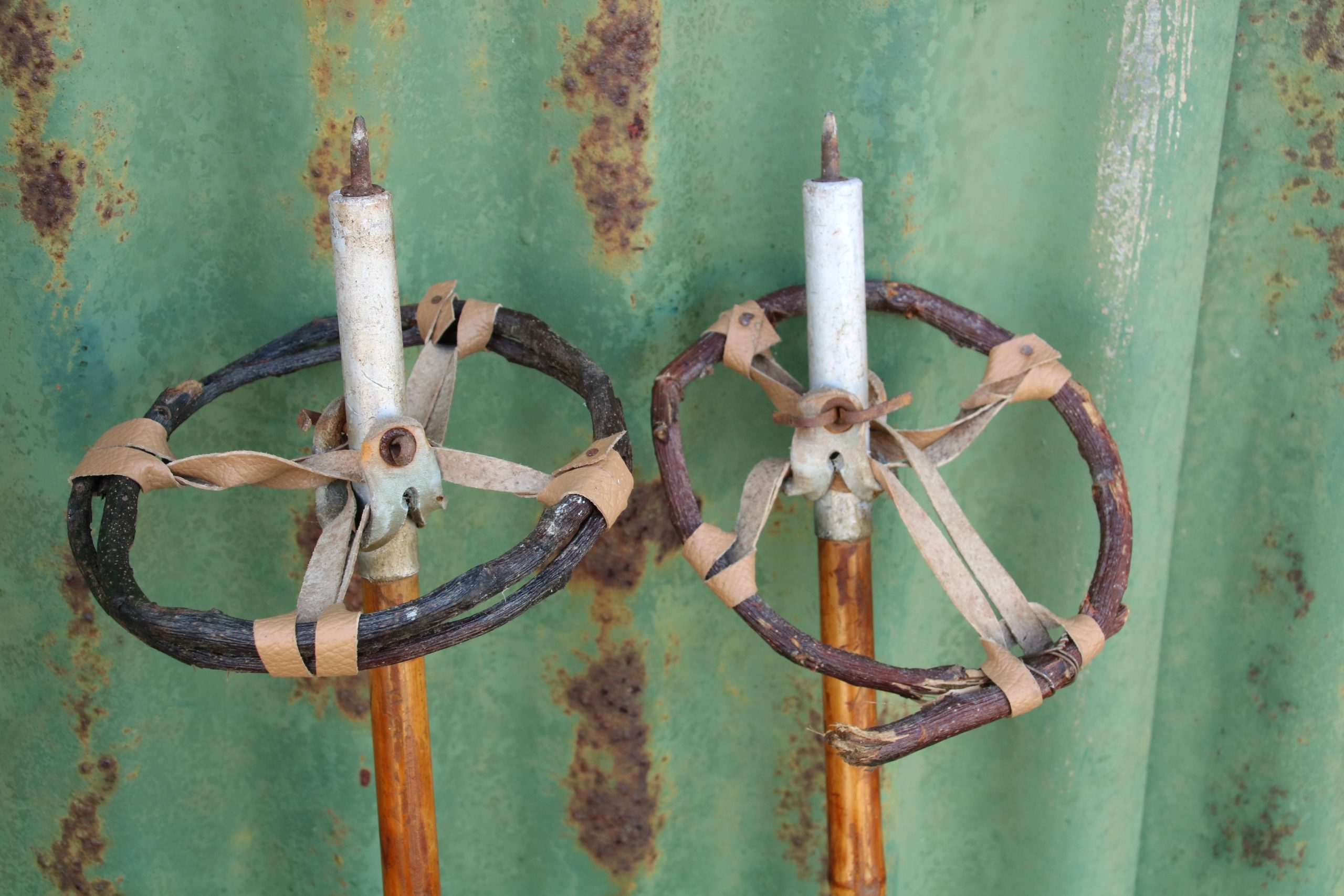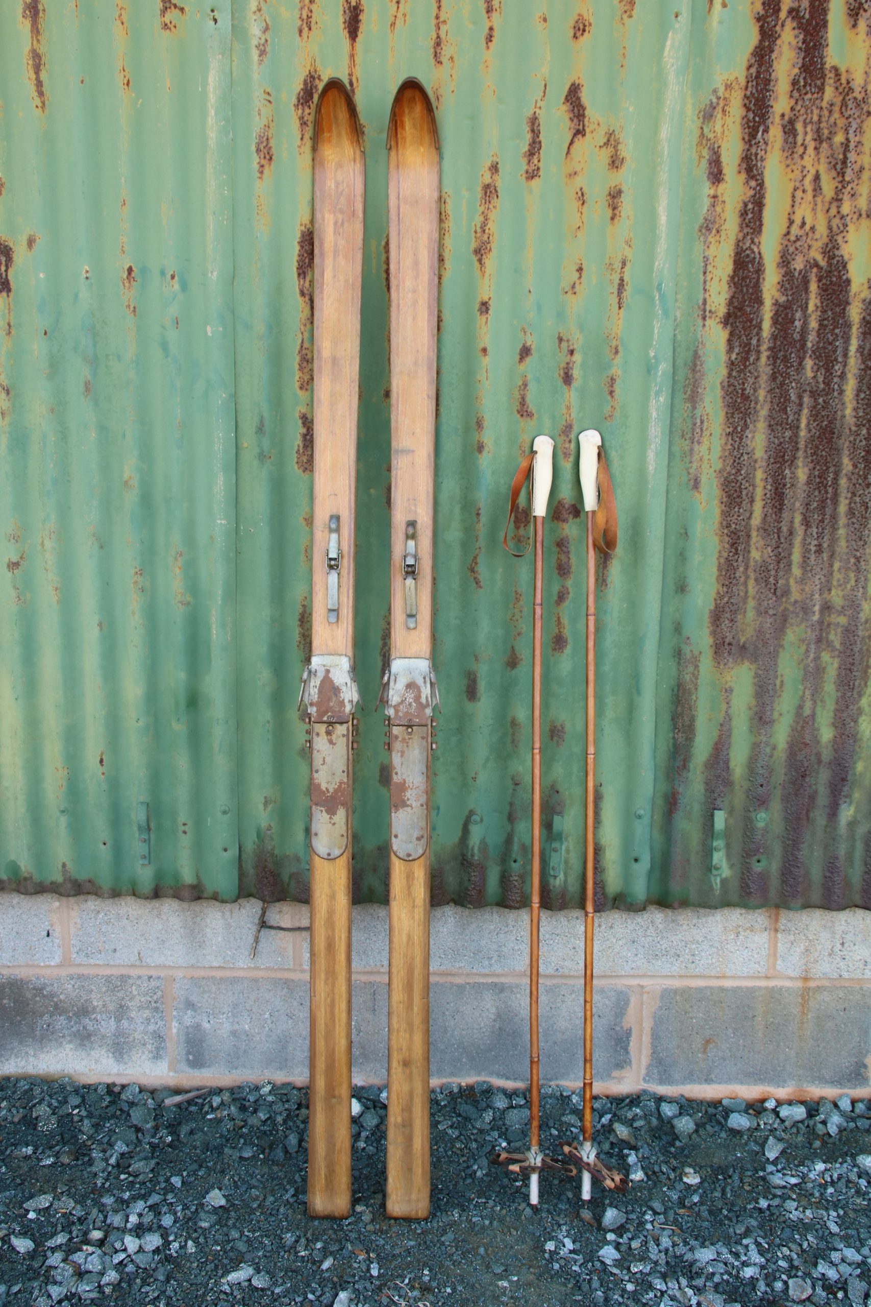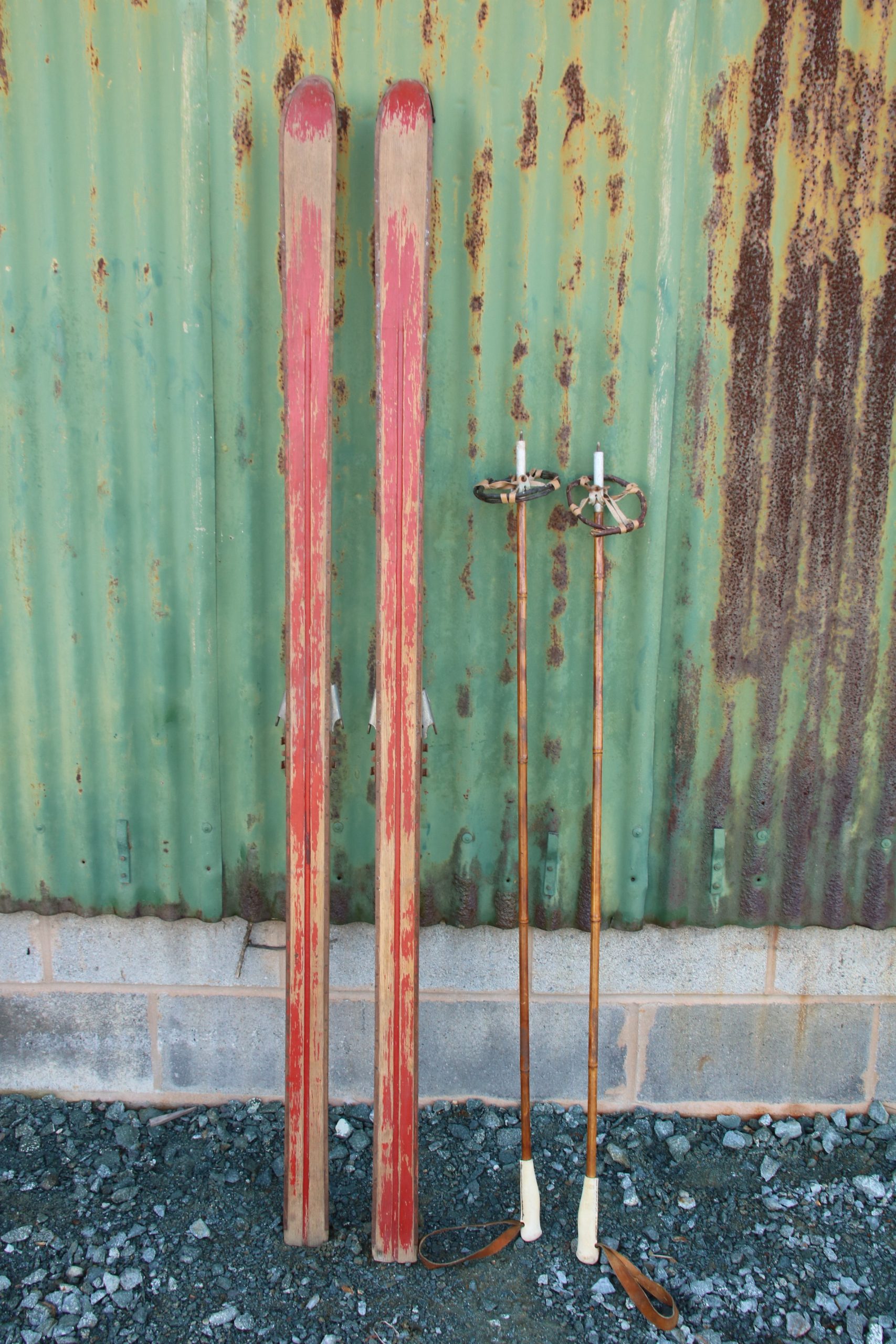 The skis are in very good, used condition with a few marks and scratches due to age. They are missing the foot straps and the skis have metal tips.