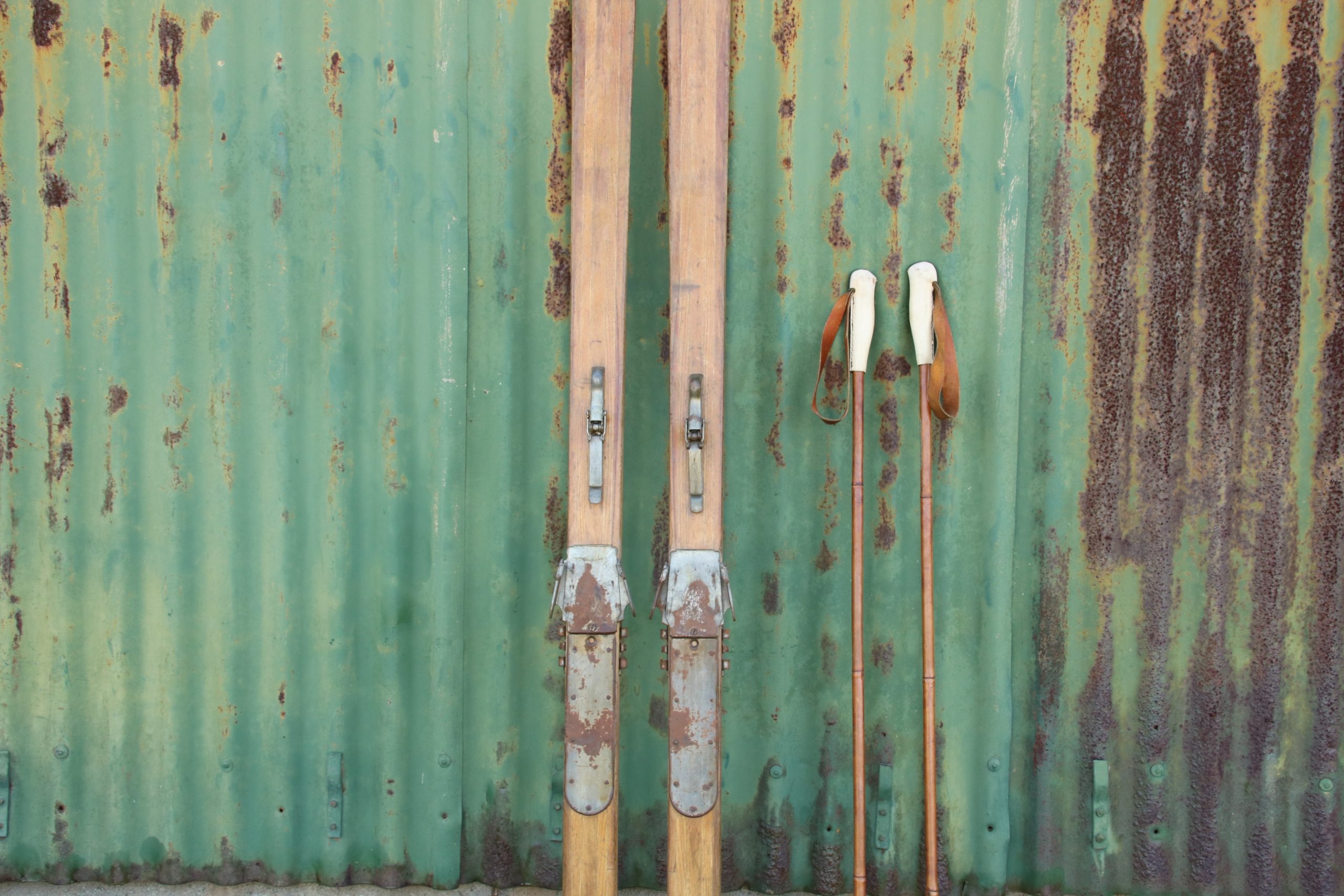A set of antique wooden skis complete with poles. Perfect for decorative purposes, at home or in a shop display.