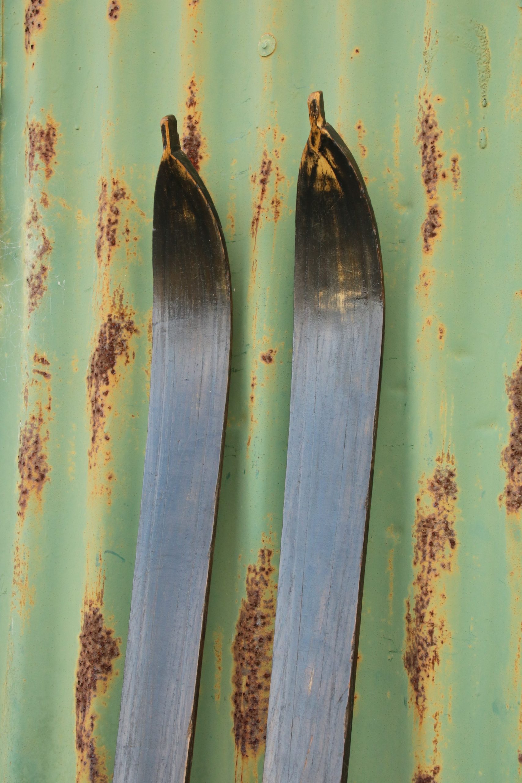 The skis are in very good, used condition with a few marks and scratches due to age. They are distressed black and have no foot straps.
