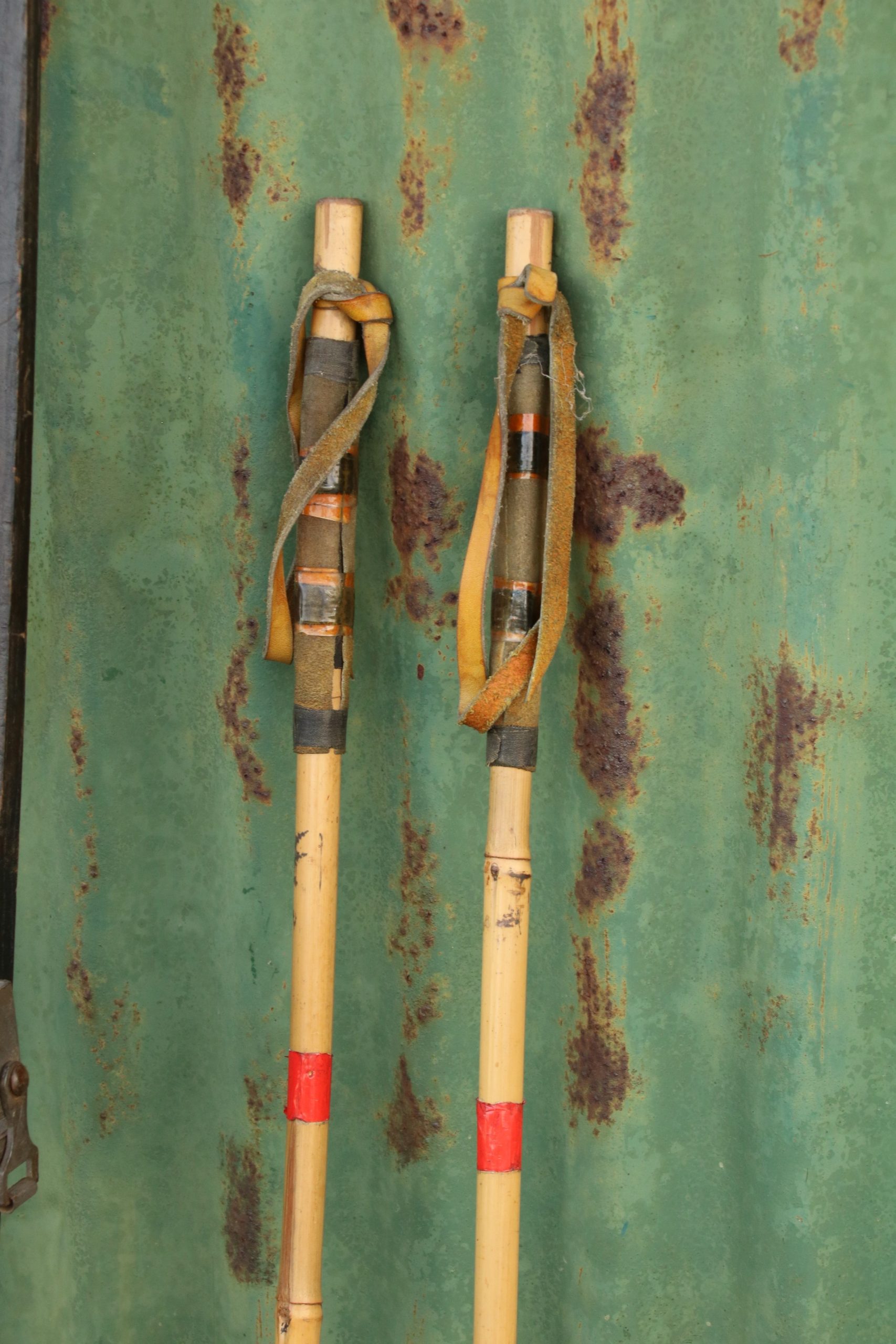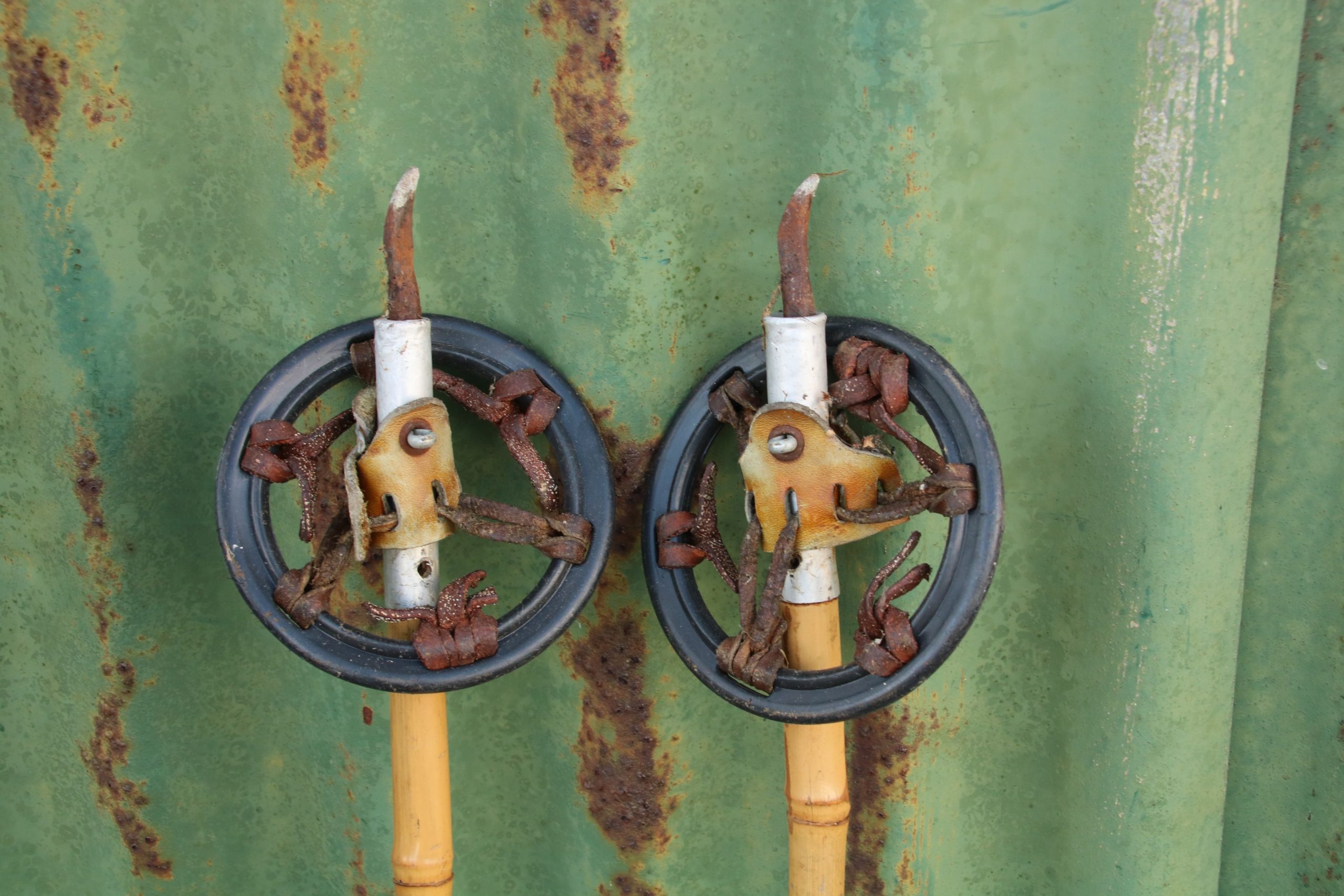 The poles are made from bamboo and are in good condition. The discs are a little worn and some of the strapping has snapped.