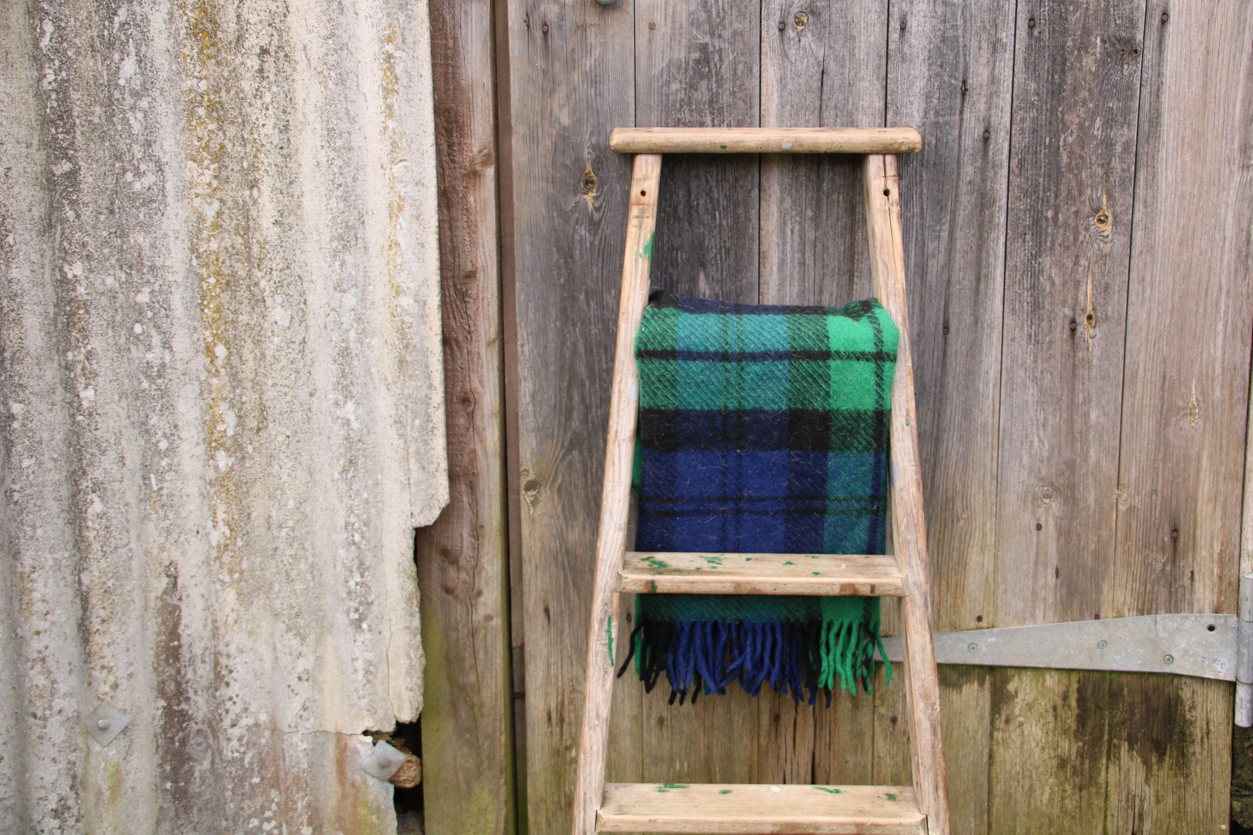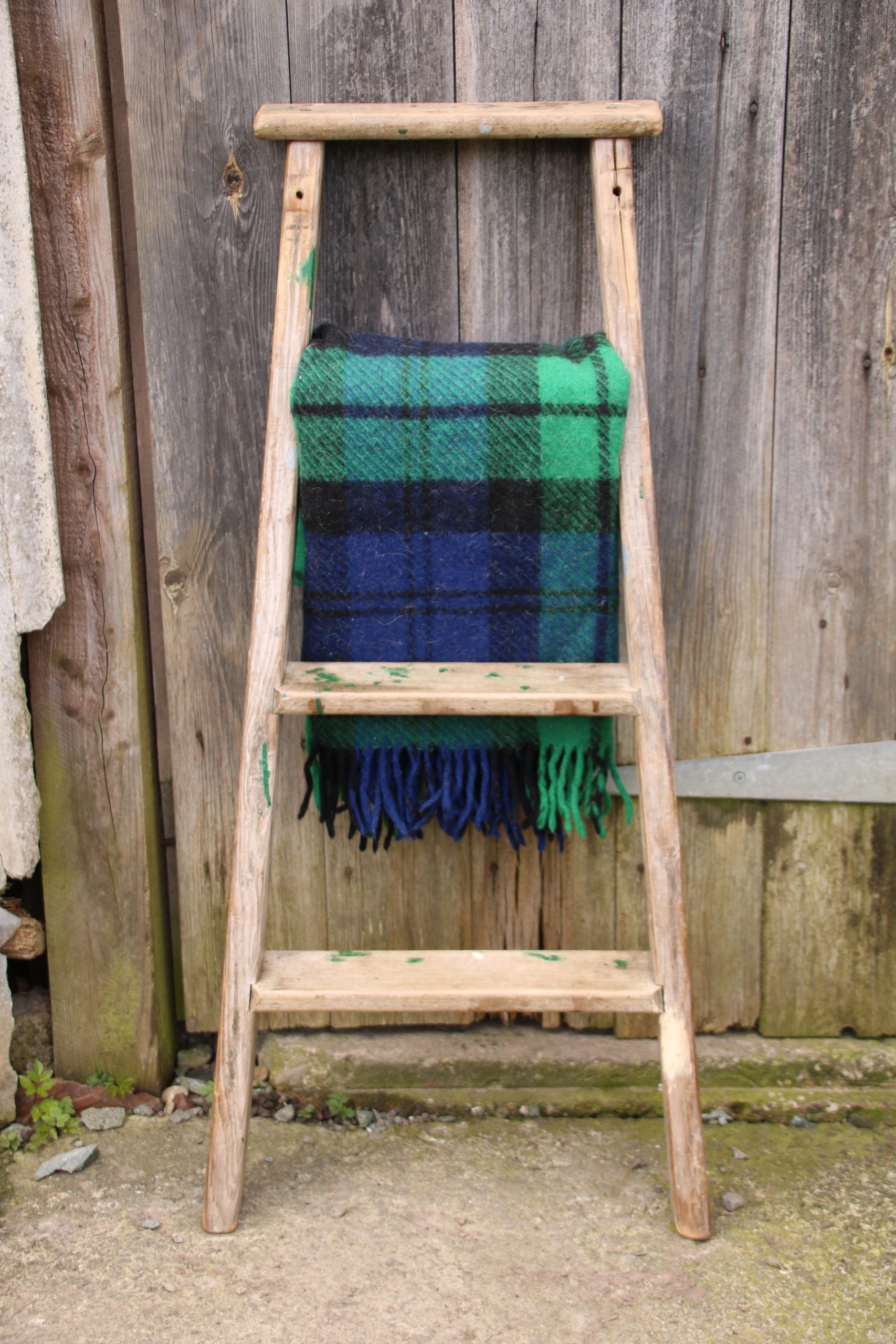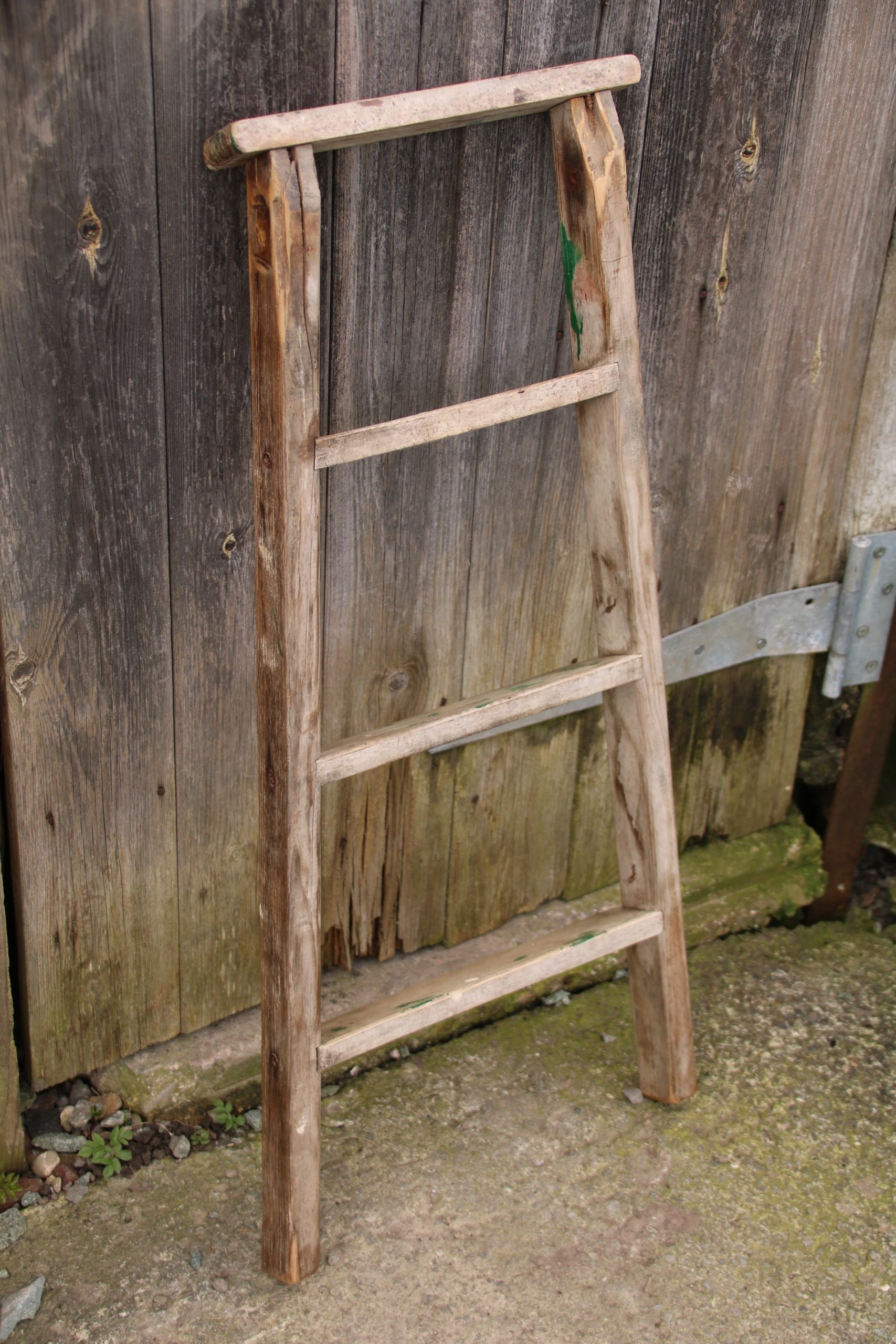 A small industrial, old wooden ladder. Perfect for leaning against a wall to store towels or blankets.