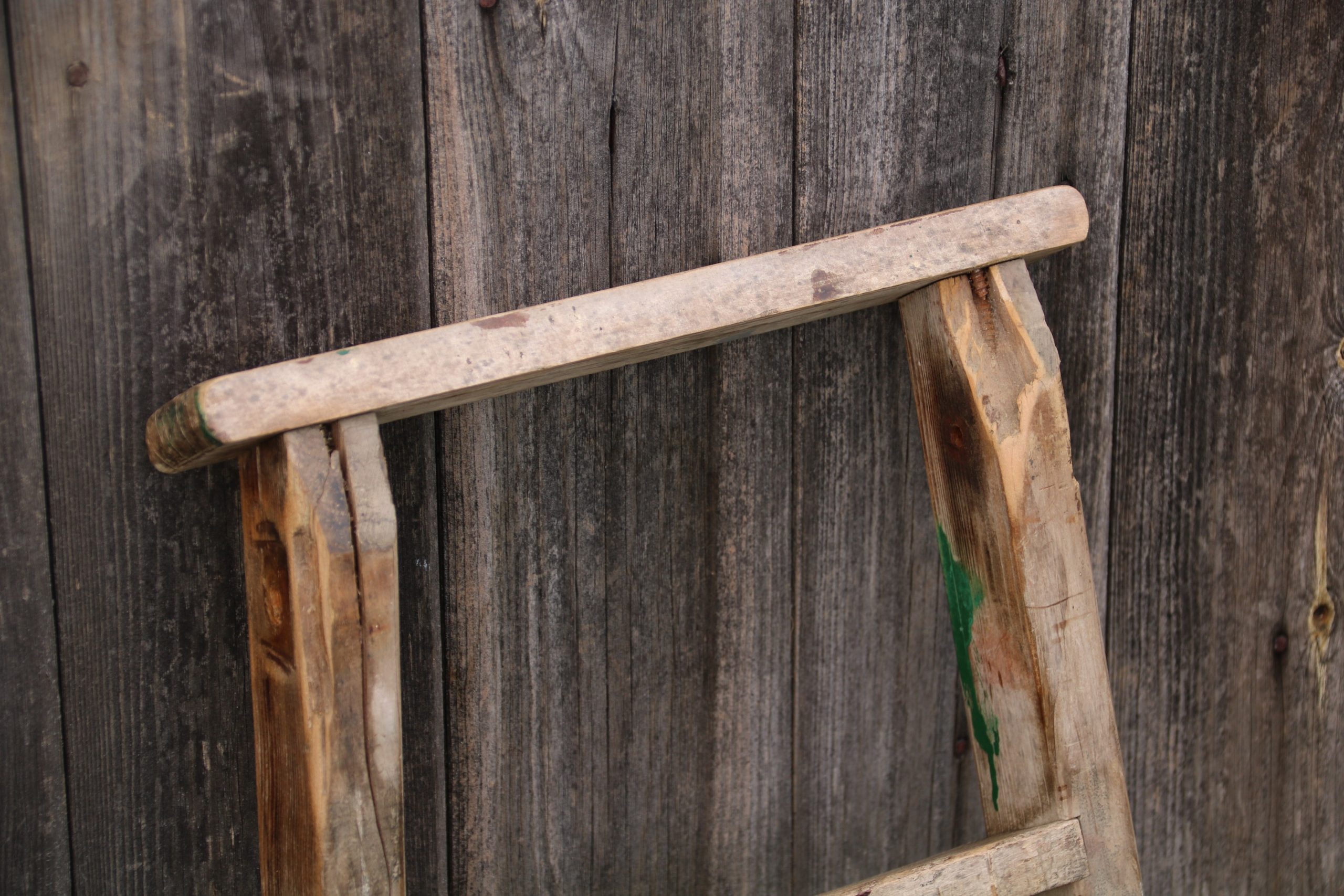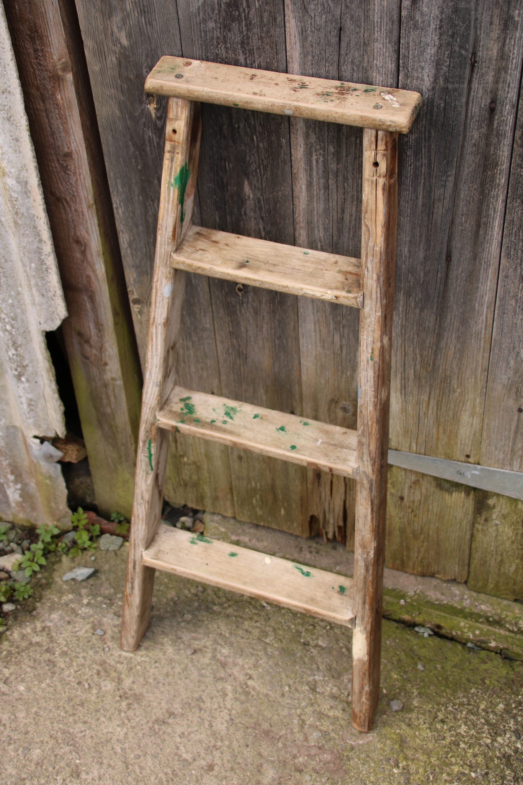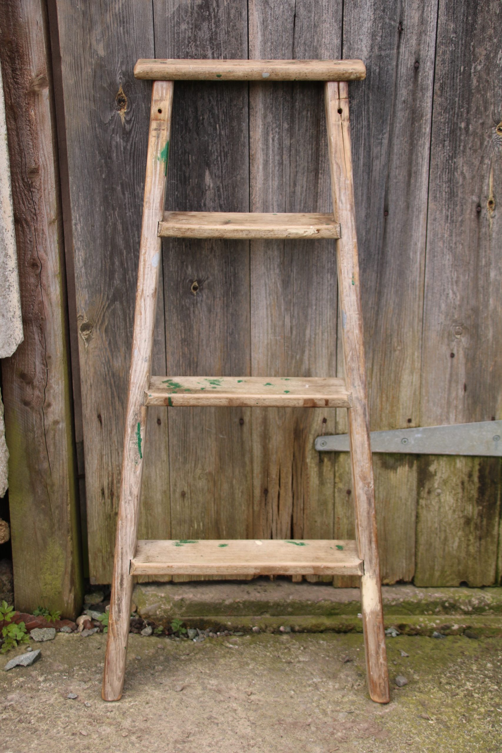 The ladder is in very good, used condition with a few marks due to age. There is a solid split on one upright at the back and it has a few original paint splatters.