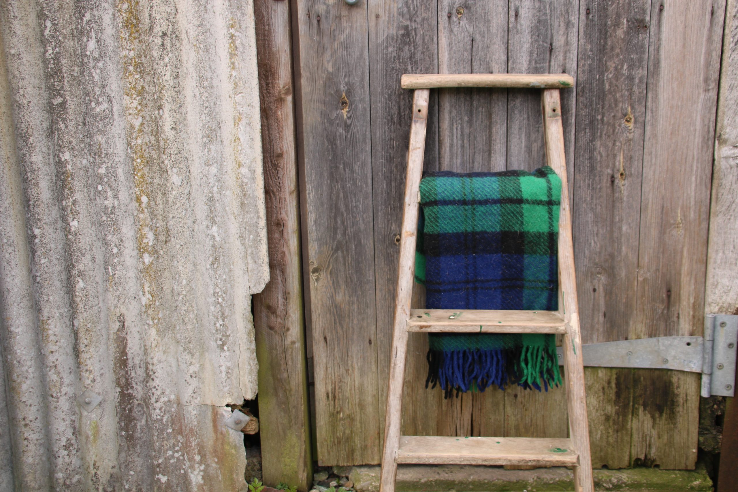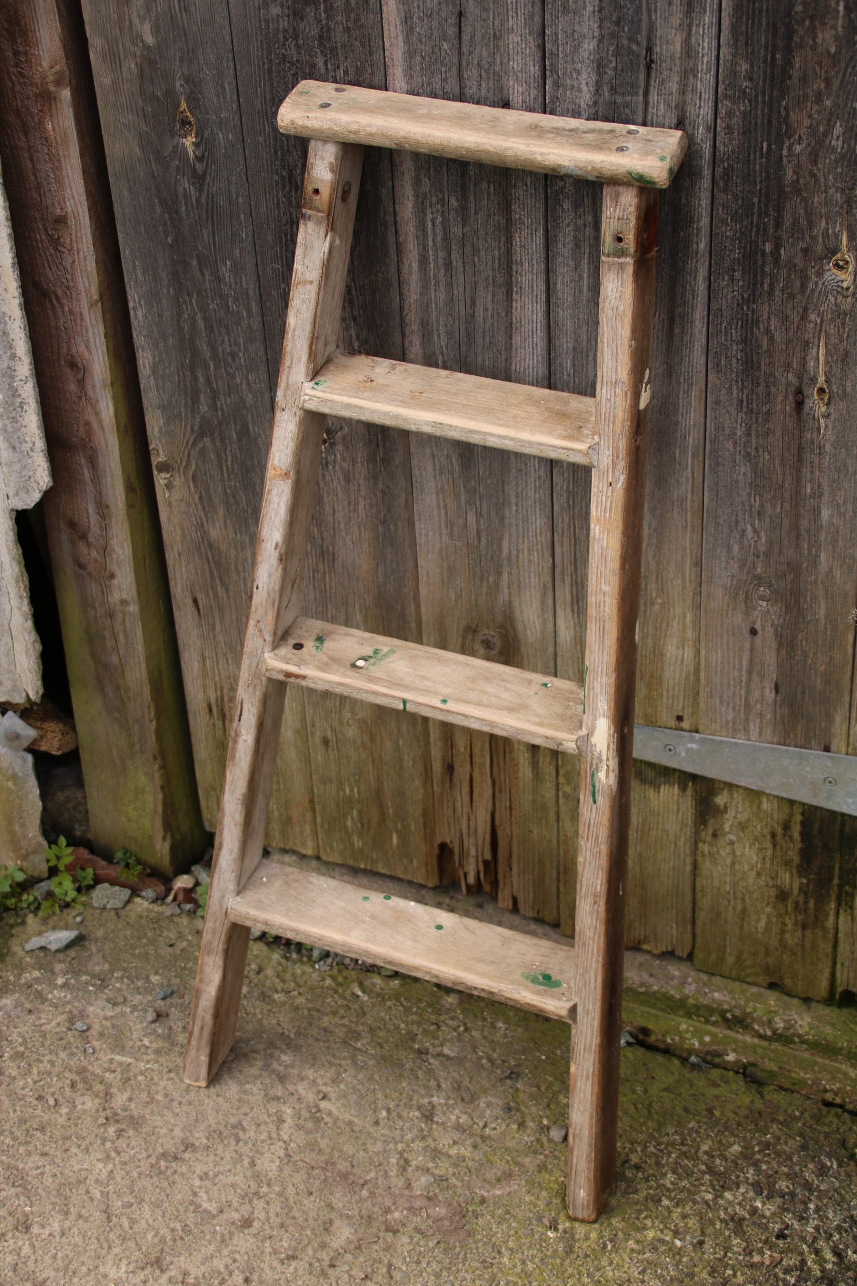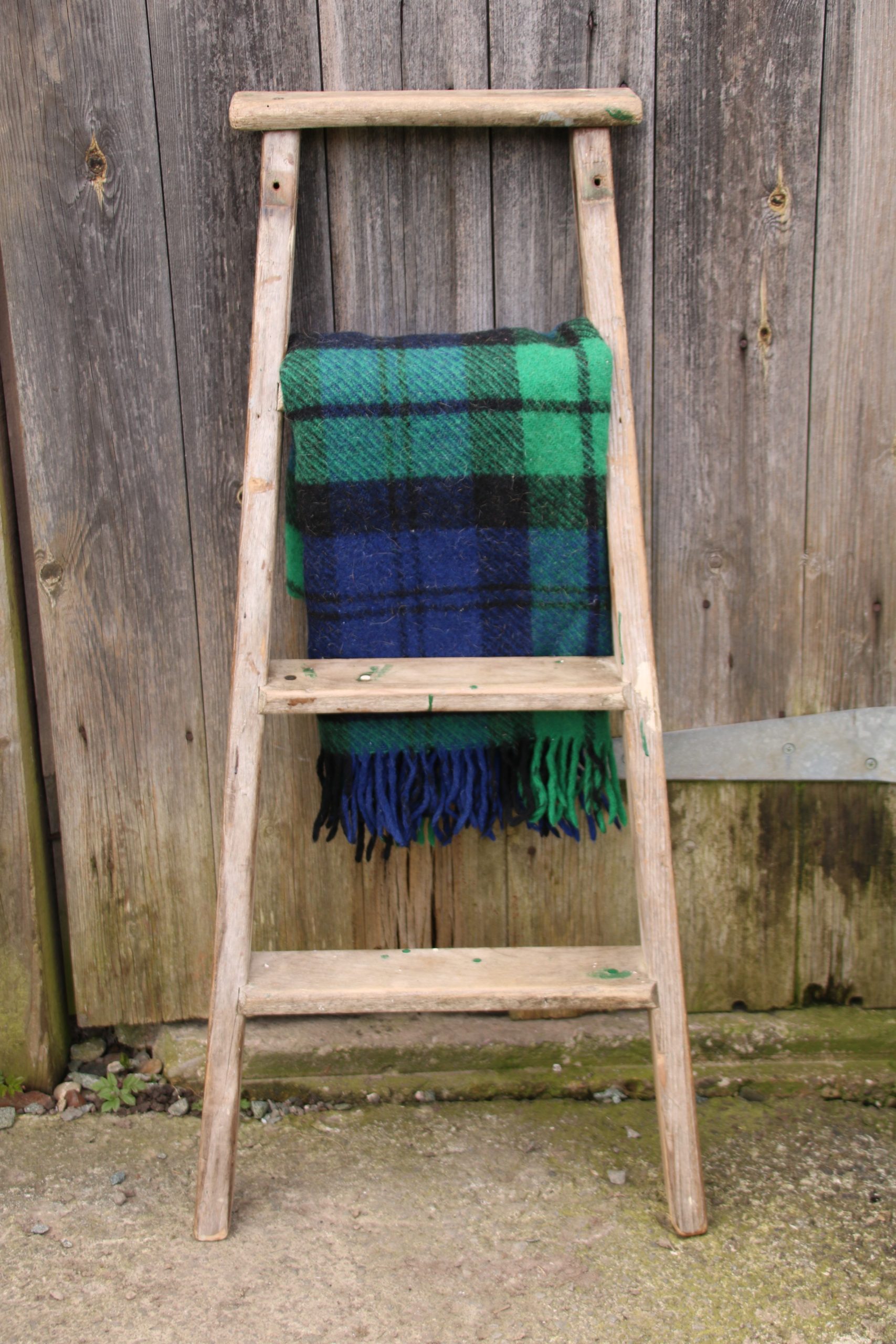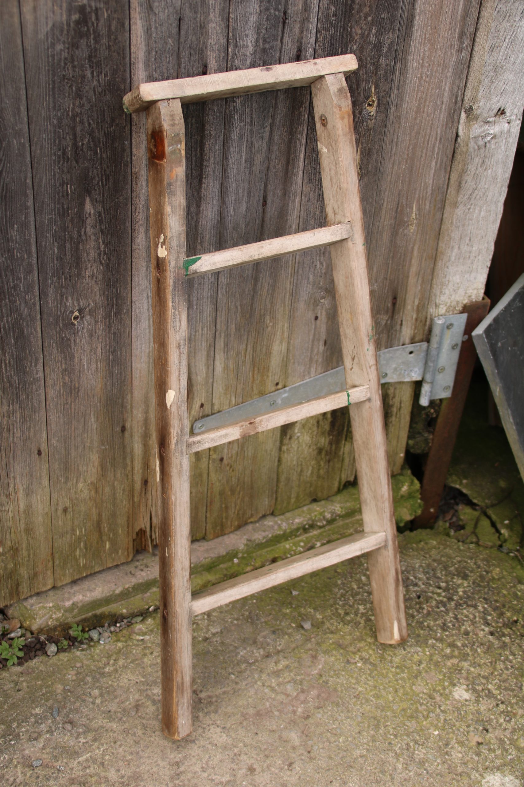 A small industrial, old wooden ladder. Perfect for leaning against a wall to store towels or blankets.