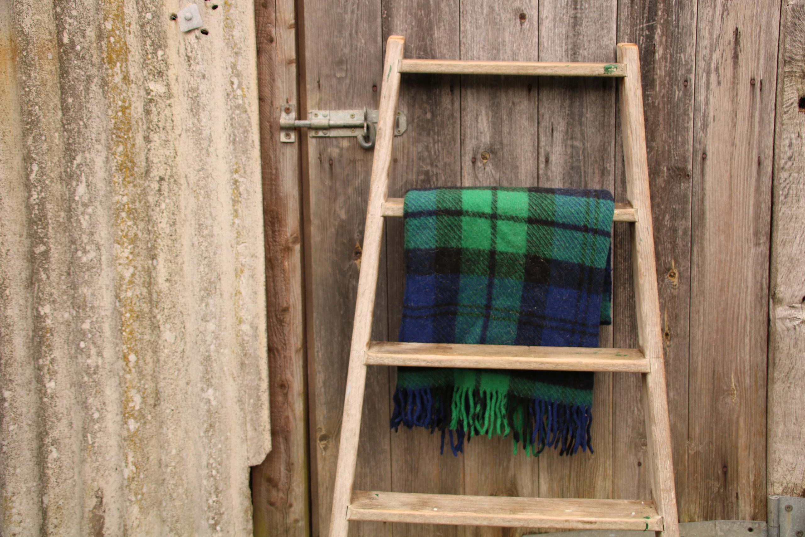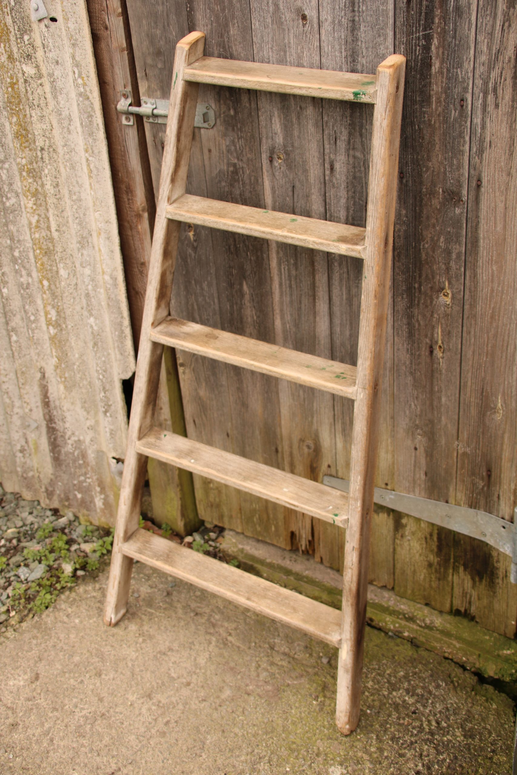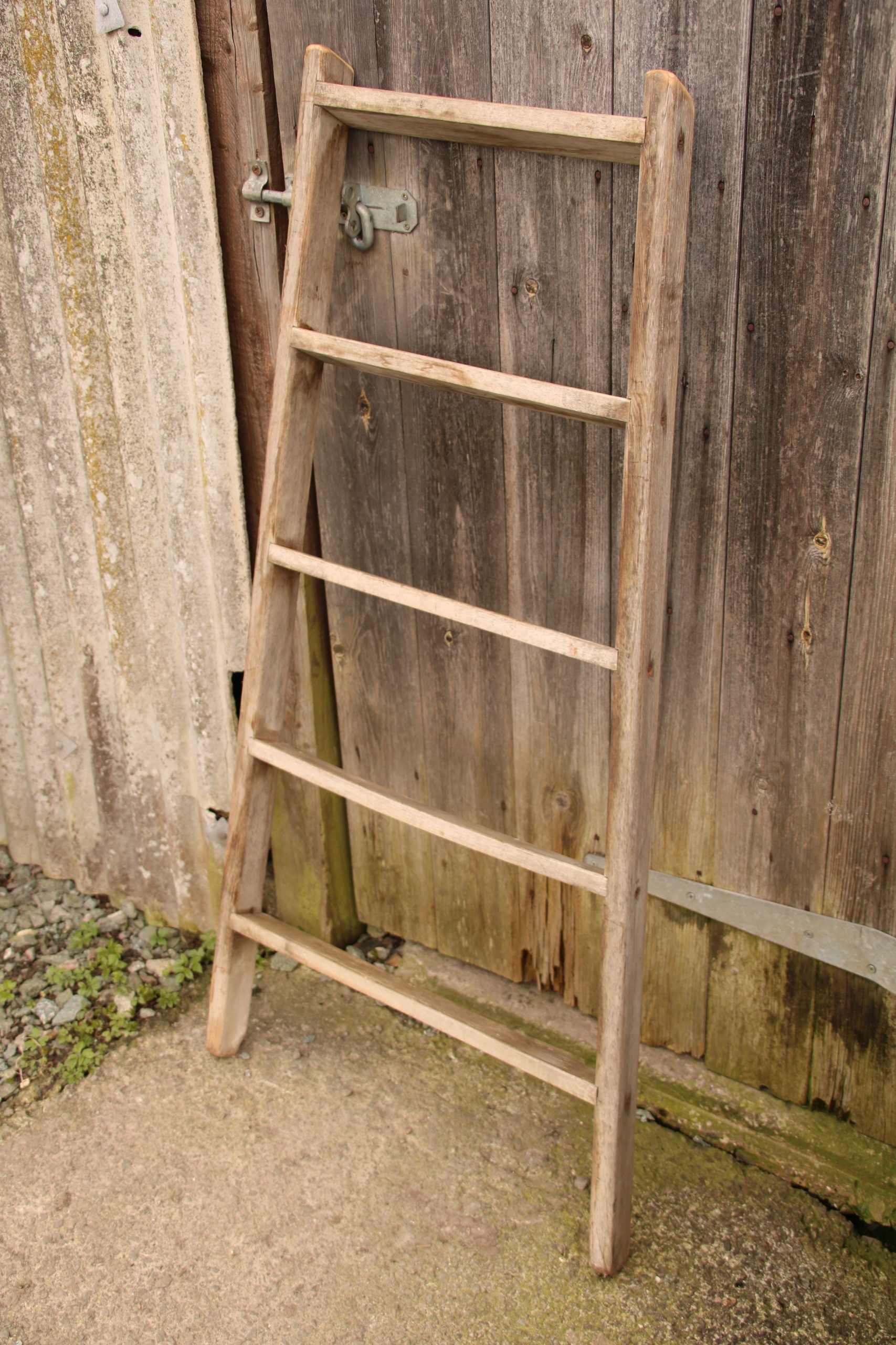 A small industrial, old wooden ladder. Perfect for leaning against a wall to store towels or blankets.