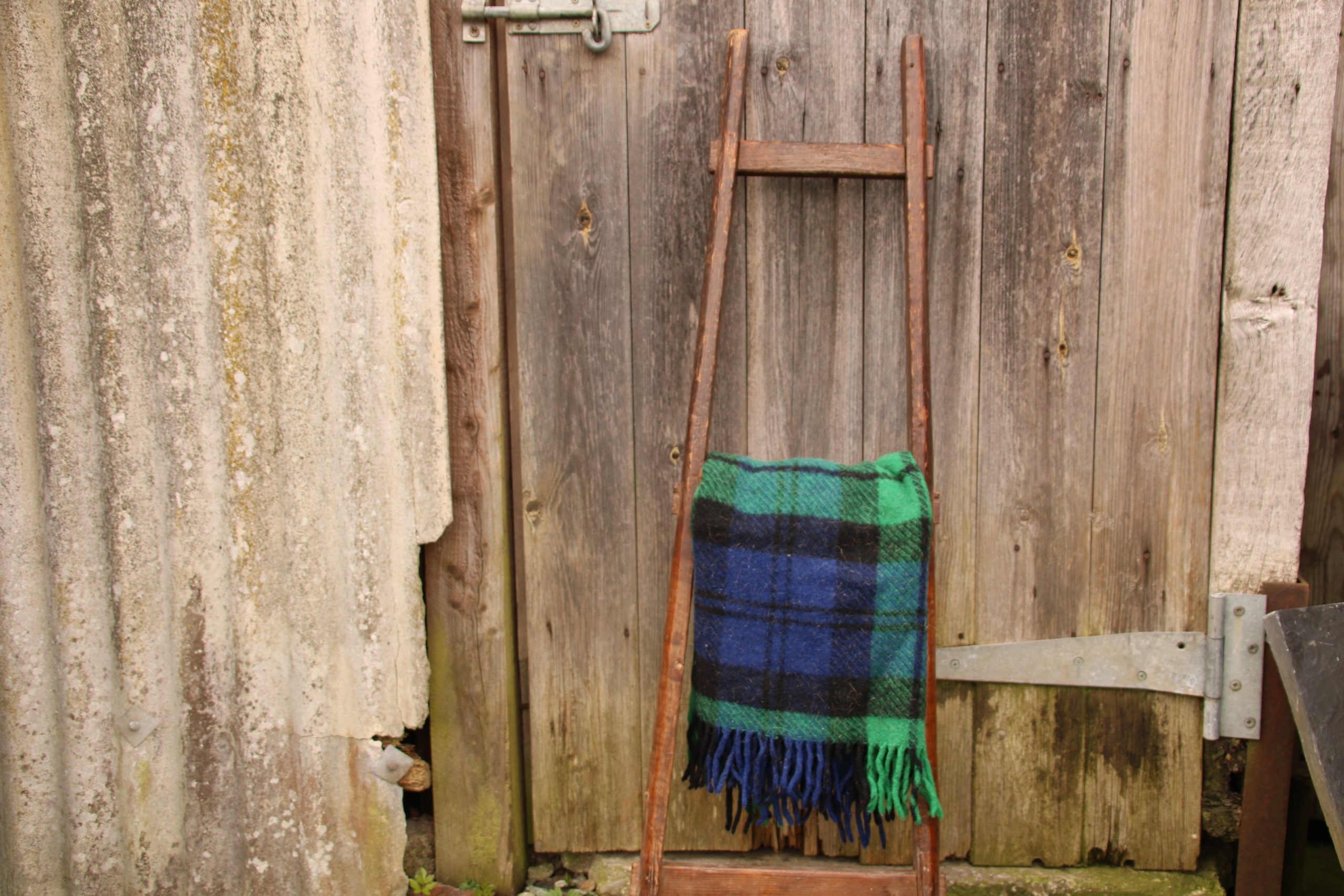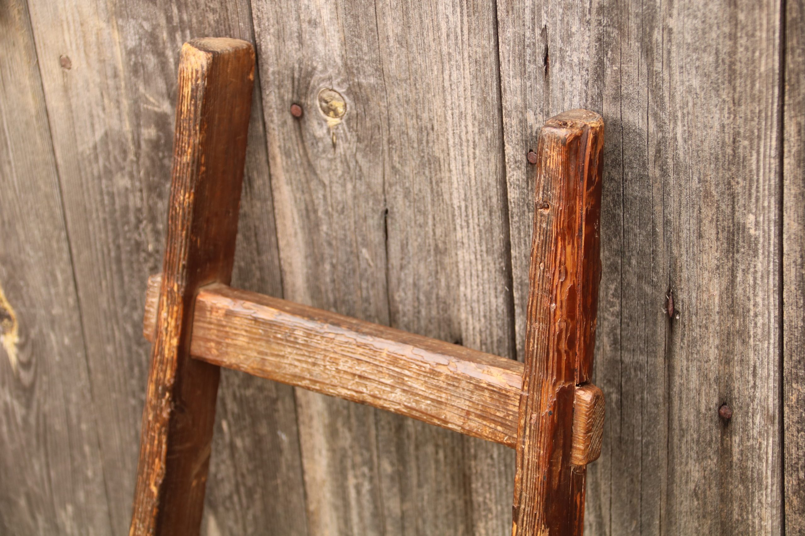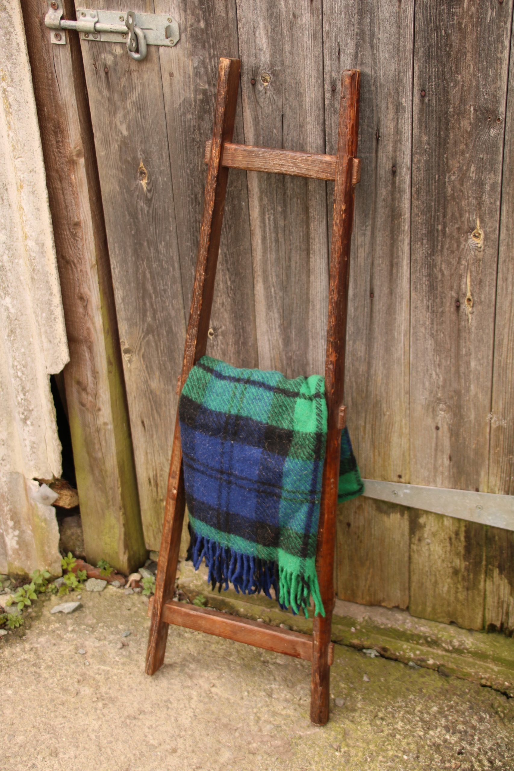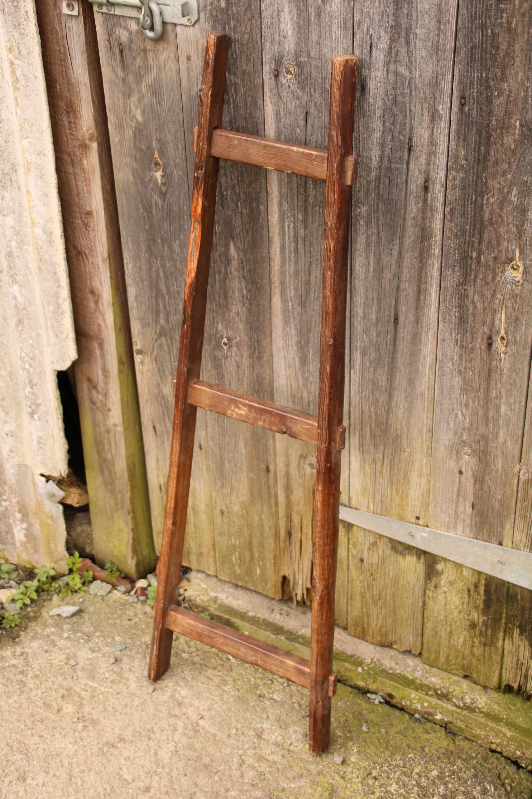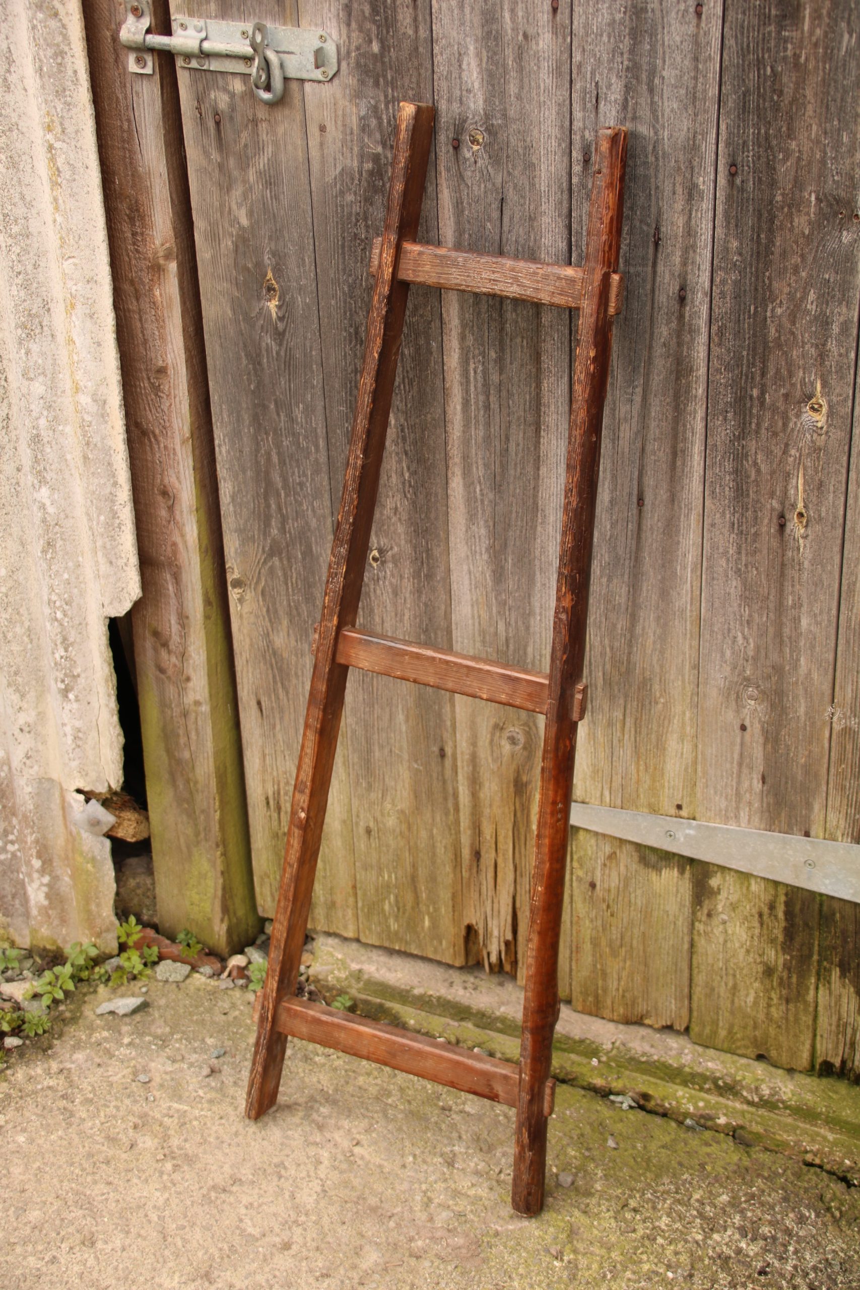 A small industrial, old wooden ladder. Perfect for leaning against a wall to store towels or blankets.