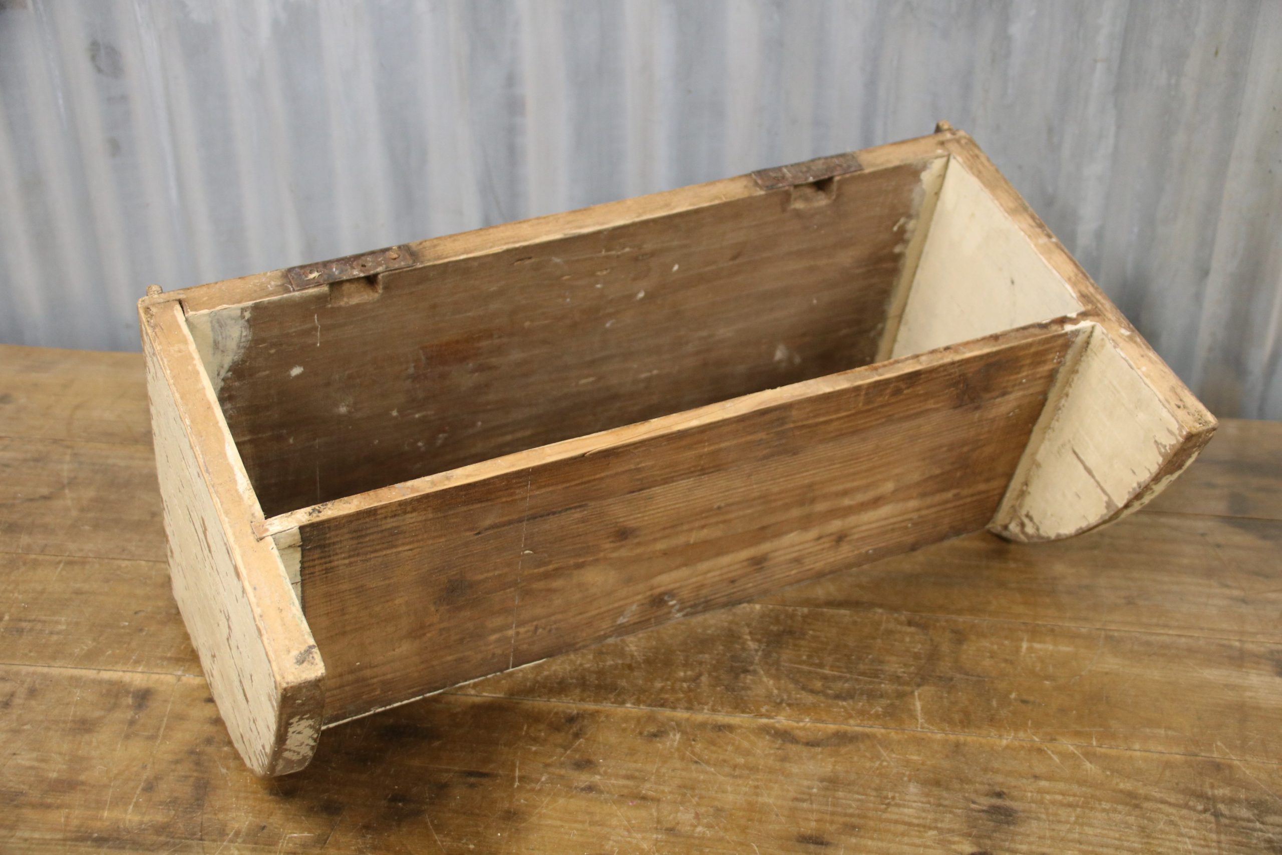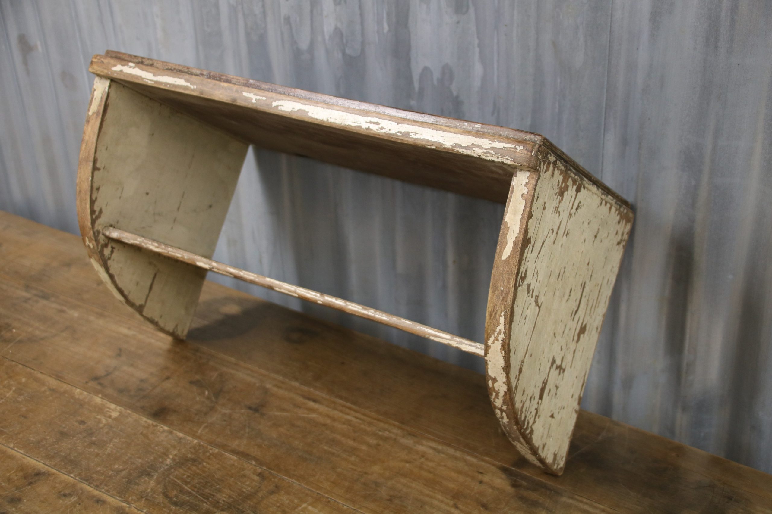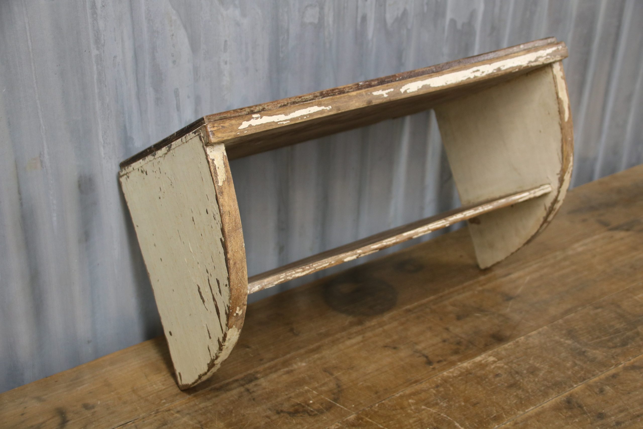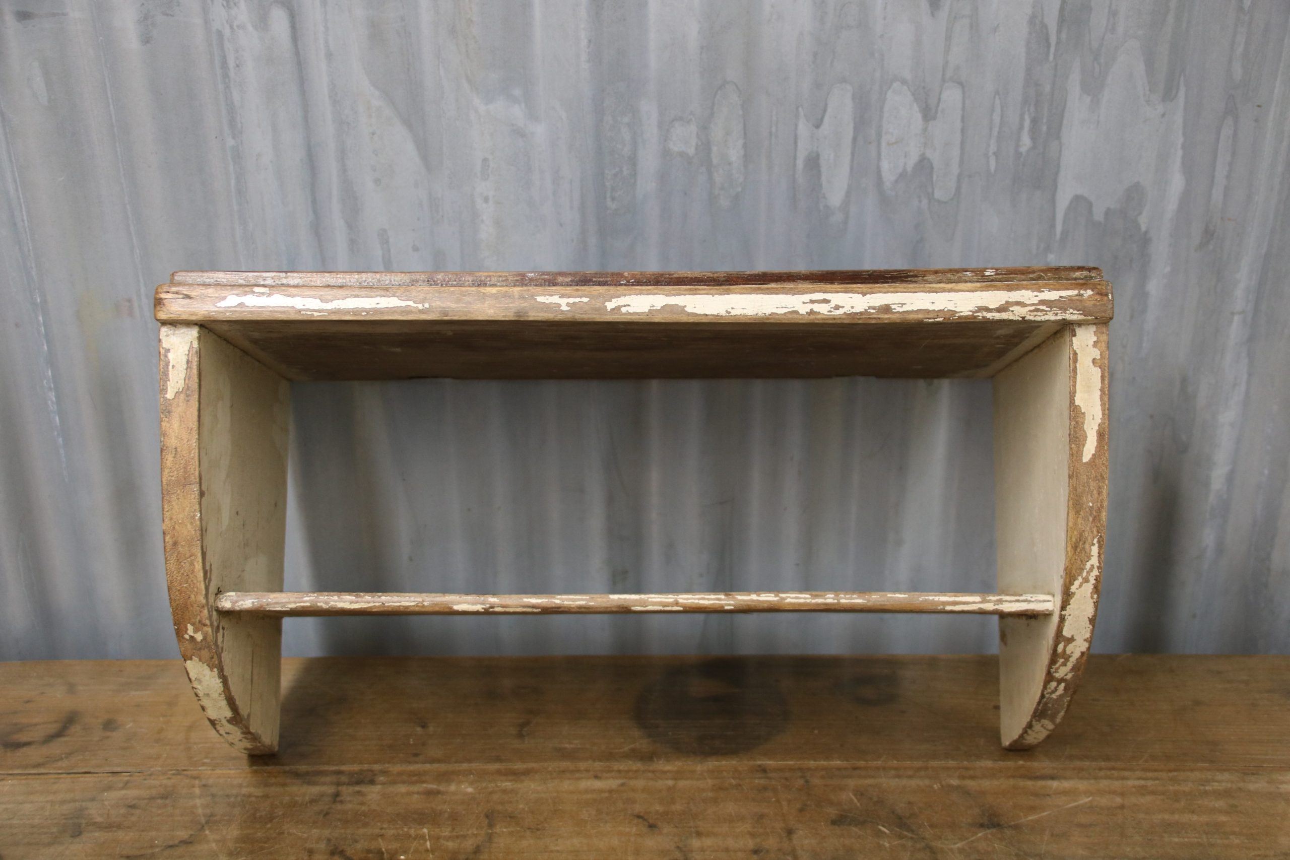 The shelf is in very good condition with a few marks, stains and scratches due to age. It has original distressed cream paintwork and two metal brackets on the back. There is a lip around the top to prevent baskets etc from falling off. There is a very small amount of old woodworm which has been thoroughly treated.
